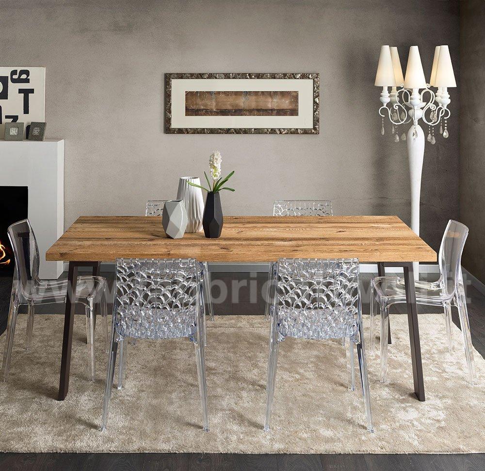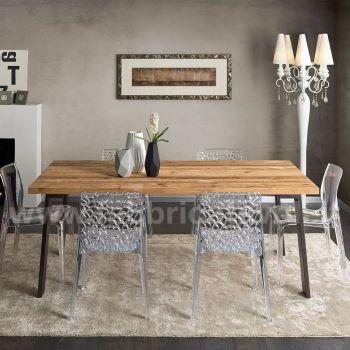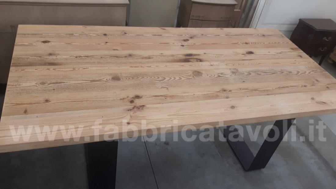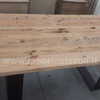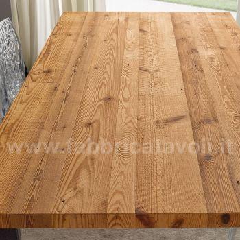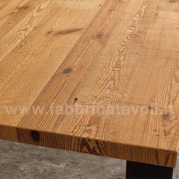 Tavolo con piano massello di 45mm in legno di Conifera antica trattato a cera naturale. Il legno proviene dal recupero di assali e travi di vecchie cascine.