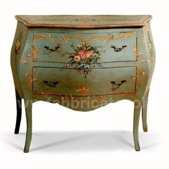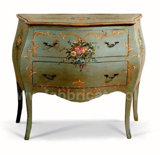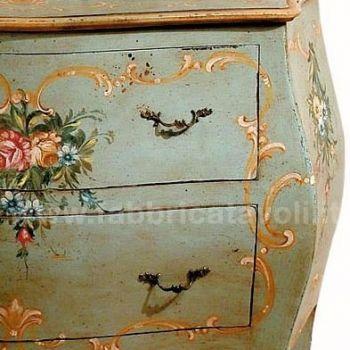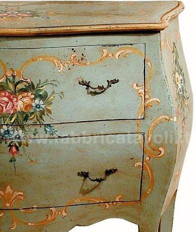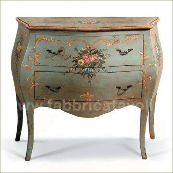 Comò bombato in legno realizzato con colore verde invecchiato. Si tratta di un comò bombato a due cassetti con finitura laccato e decorato a mano..