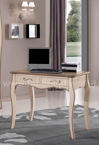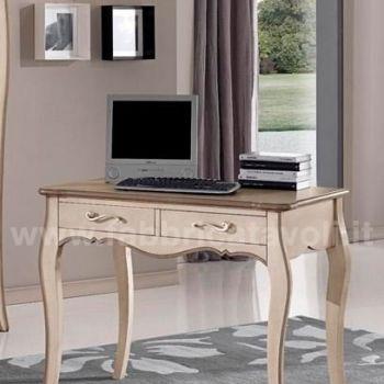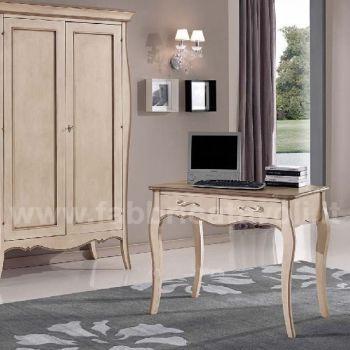 Scrittoio massello con due cassetti, gambe sagomate di linea sfuggente. Piano rettangolare, frontali cassetti a filo. Finitura avorio anticato con profili tortora.