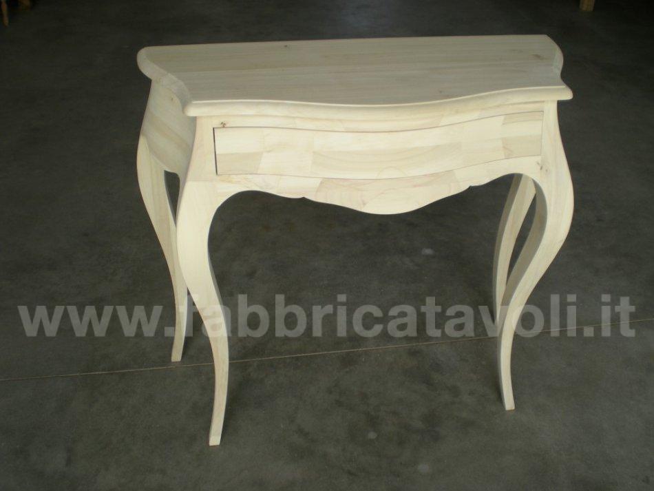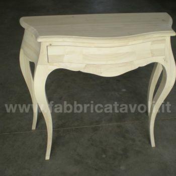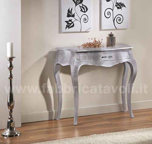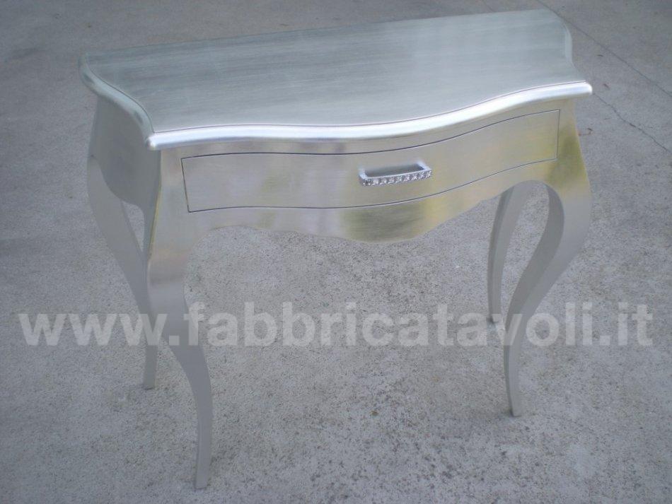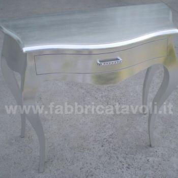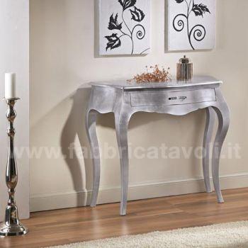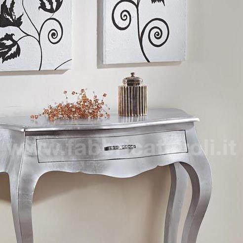 Consolle bombata in legno un cassetto, con finitura foglia oro, foglia argento, foglia rame, oppure laccato bianco il tutto super brillante. Completo con maniglie di Strass Swarovski.