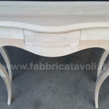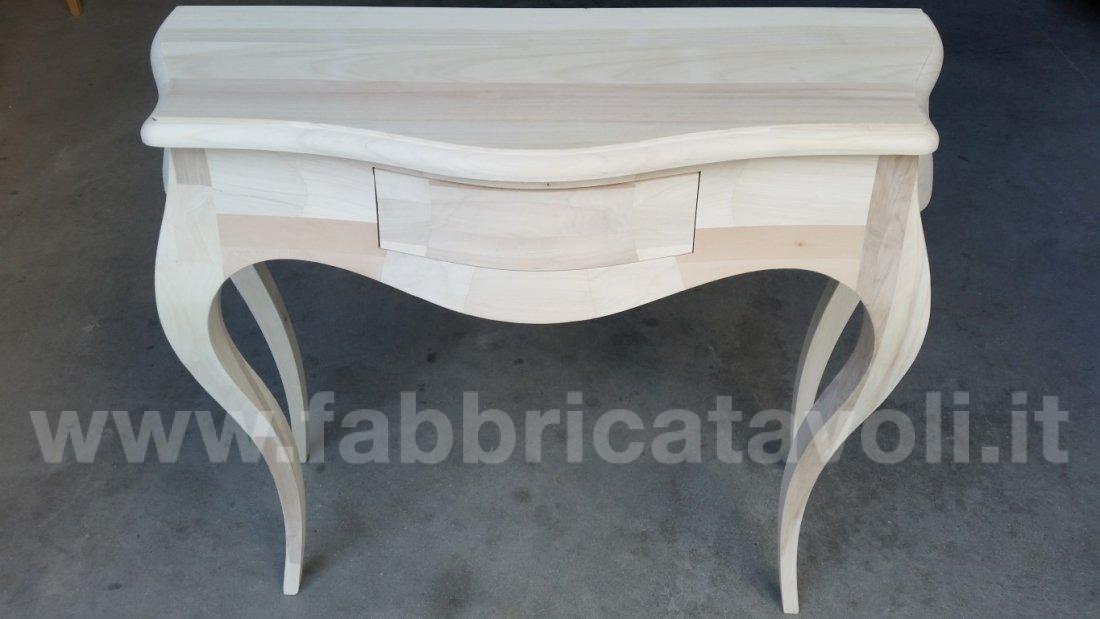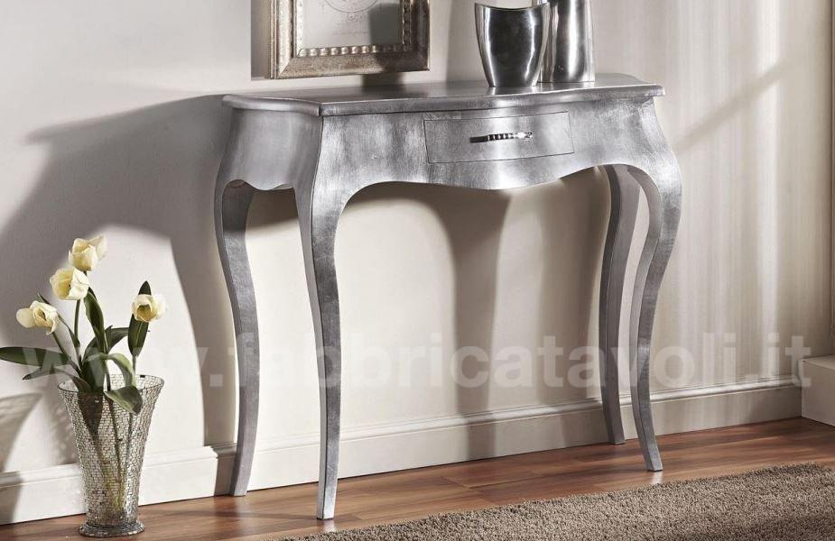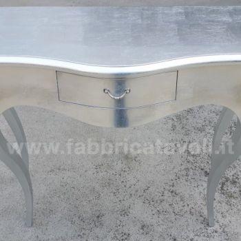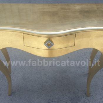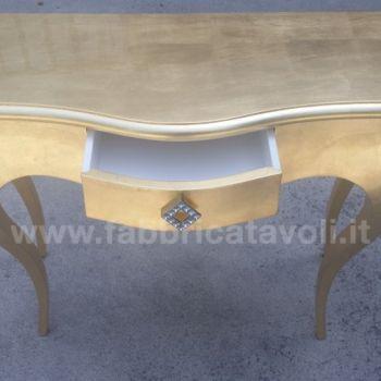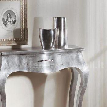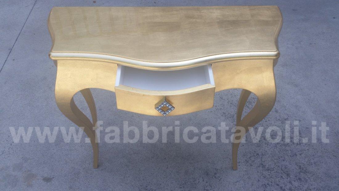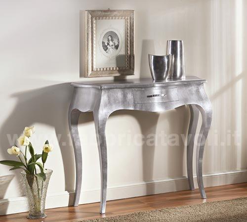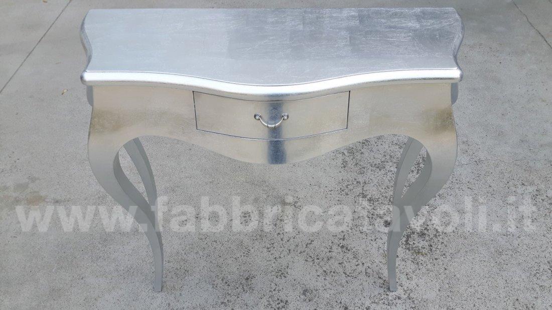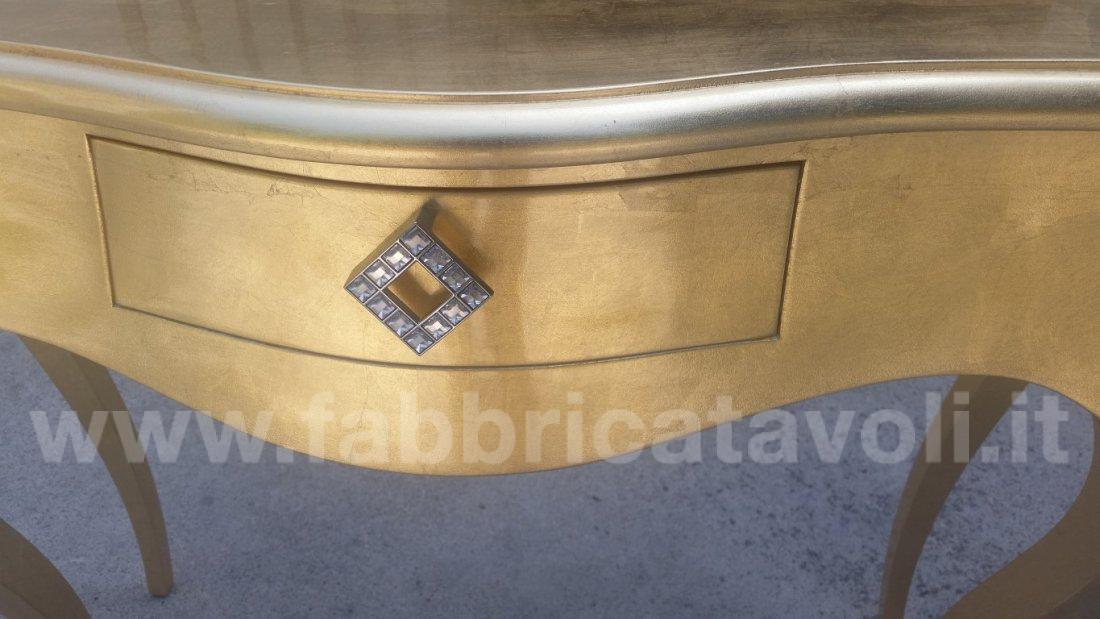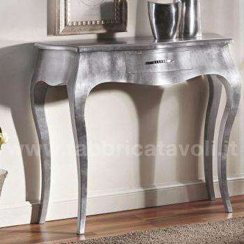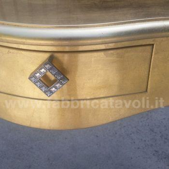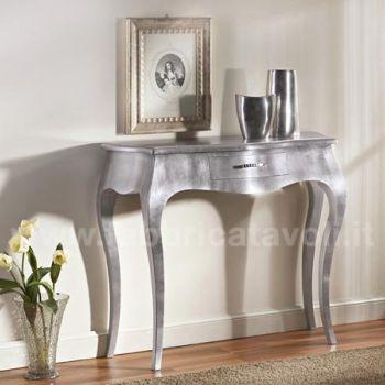 Consolle bombata in legno un cassetto, con finitura foglia oro, foglia argento, foglia rame, oppure laccato bianco il tutto super brillante. Completo con maniglie pregiate di Strass Swarovski.