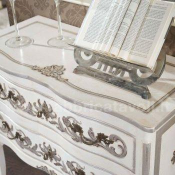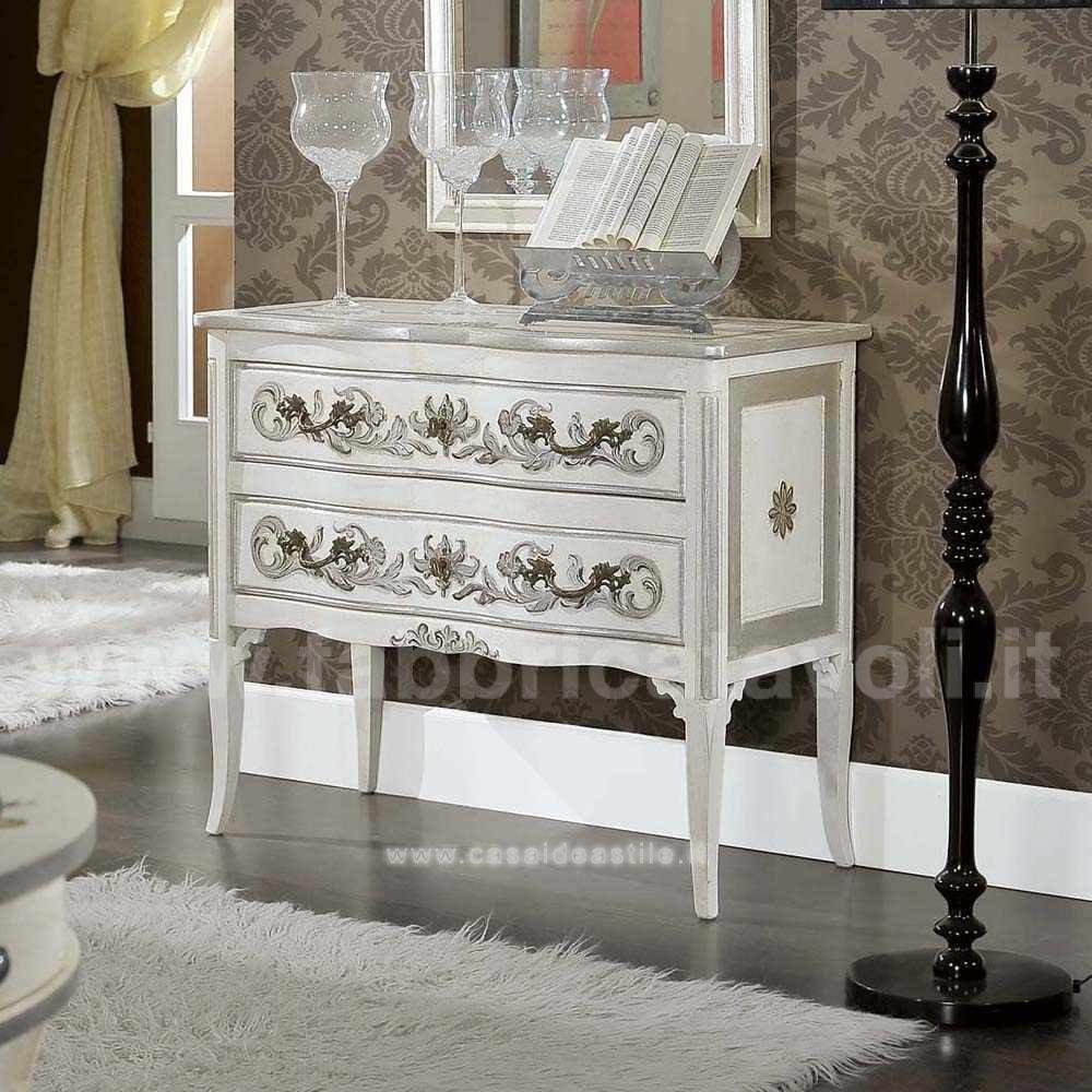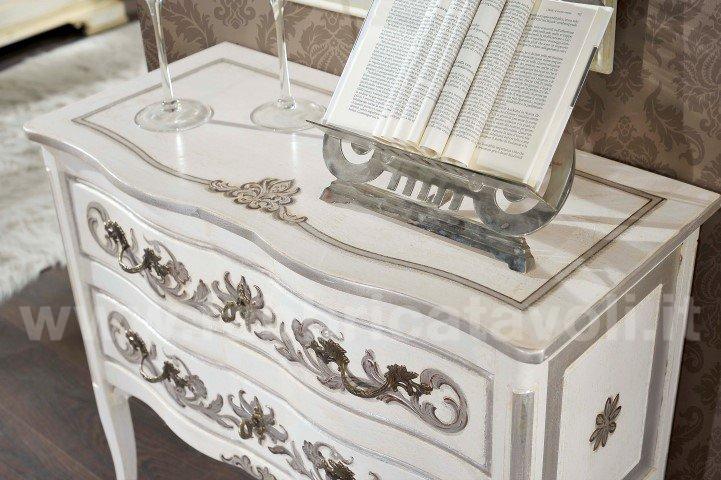 Comò 2 cassetti laccato bianco con decoro foglia argento,finiture con dettagli in rilievo fatti con tecniche tradizionali e realizzate completamente a mano da abili decoratori.
