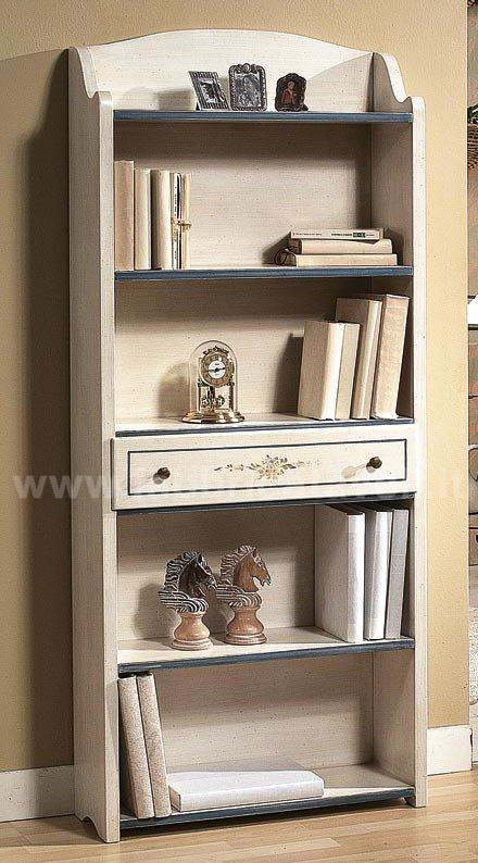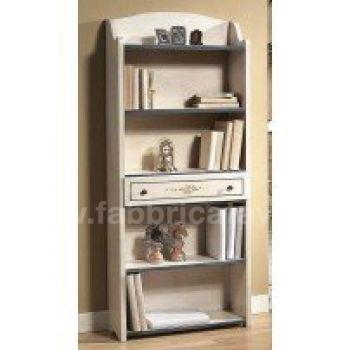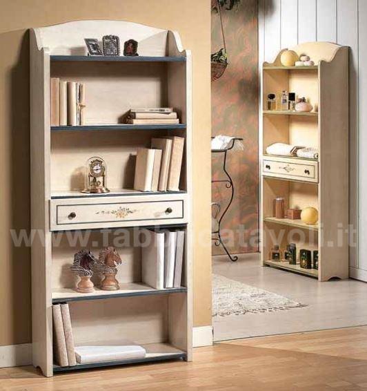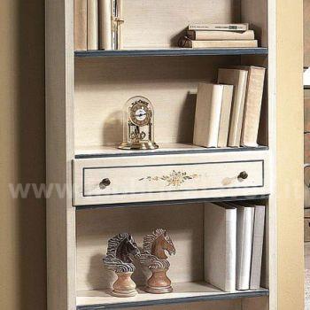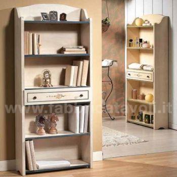 Etajere con un cassetto e cinque vani a giorno. Dipinta in bianco con filo azzurro oppure avorio con filo verde decorata a mano. Al centro del cassetto è disegnato un mazzo di fiori.