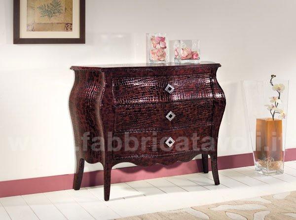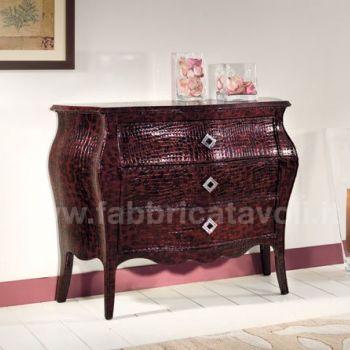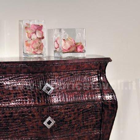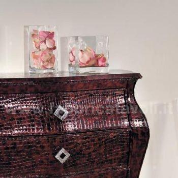 Comò bombato in legno con tre cassetti rivestito in pelle color rossa lucida e stampata ad effetto coccodrillo. Completo con maniglie di Swarovski.