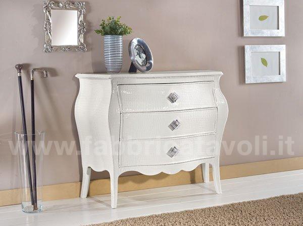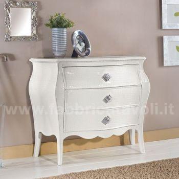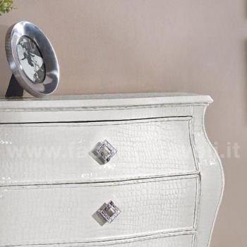 Comò bombato in legno con tre cassetti rivestito in pelle bianca lucida e stampata ad effetto coccodrillo. Completo con maniglie di Swarovski.