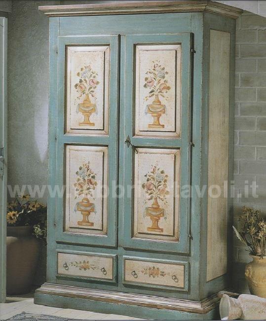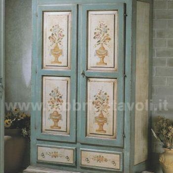 Armadio con 2 porte e 2 cassetti in legno massello. Finitura laccato azzurro/beige invecchiato arricchito da particolari disegni floreali.