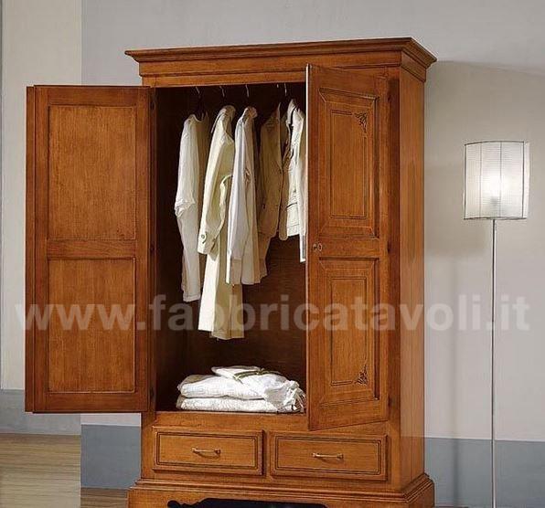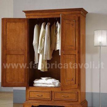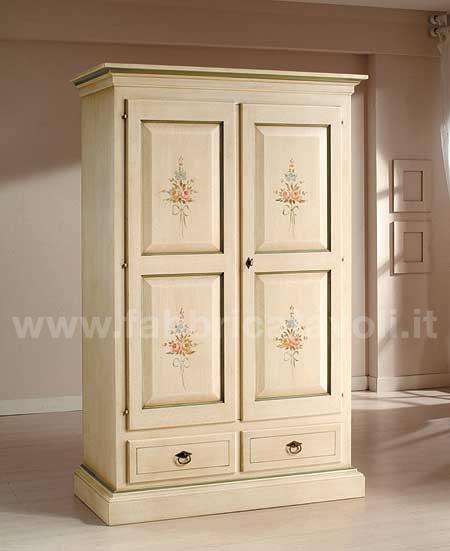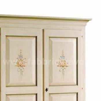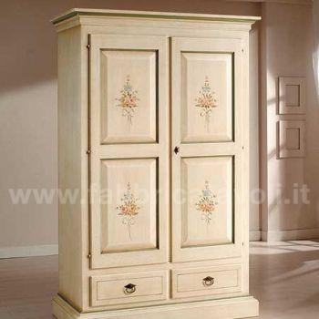 Armadio con 2 porte e 2 cassetti in legno massello. Finitura laccato avorio con filetti verdi e arricchito da un particolare decoro di fiori tenuti da un nastrino.