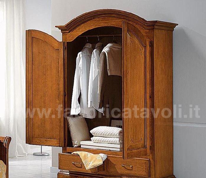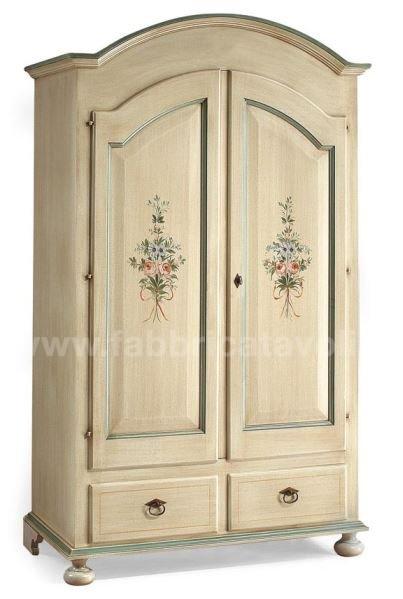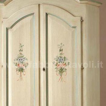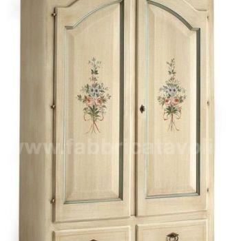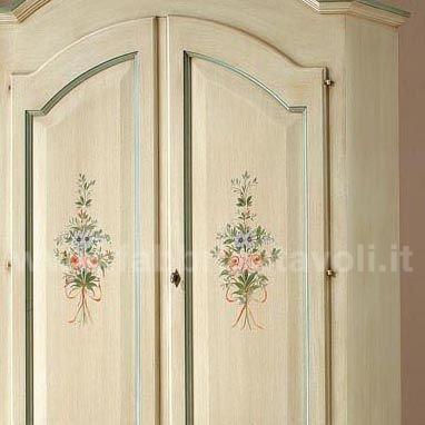 Armadio con 2 porte e 2 cassetti in legno massello. Finitura laccato avorio con filetti verde e arricchito da un particolare decoro di fiori tenuti da un nastrino.