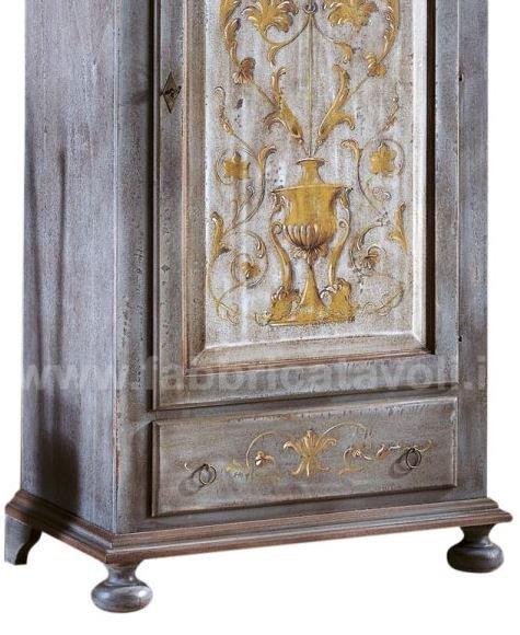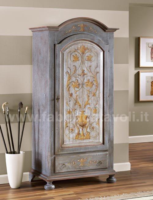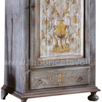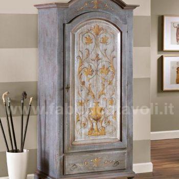 Armadio con 1 porta 1 cassetto in legno massello. Finitura colore azzurro cenere bicolore arricchita da particolari disegni floreali eseguiti a mano.