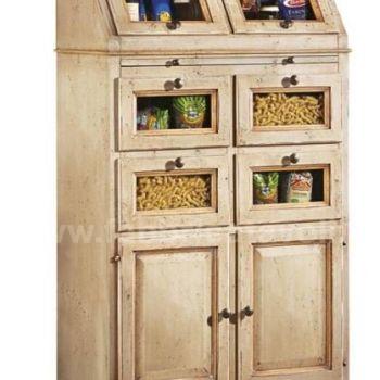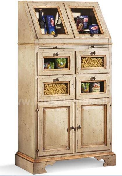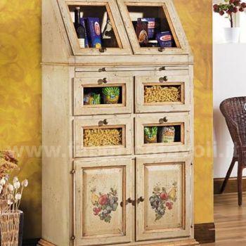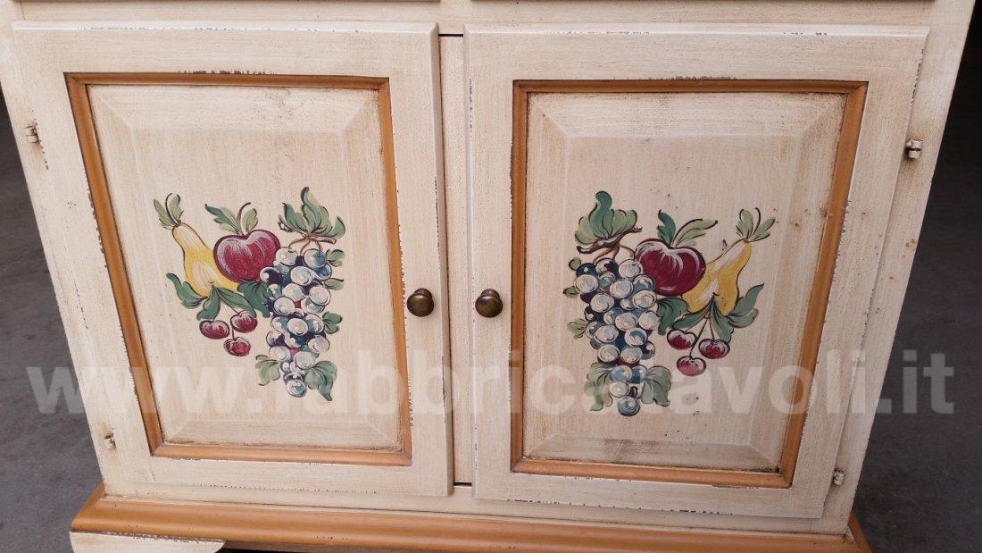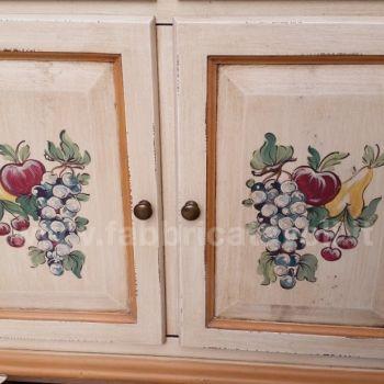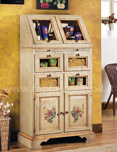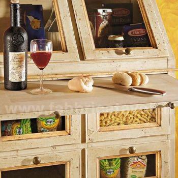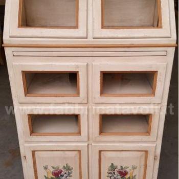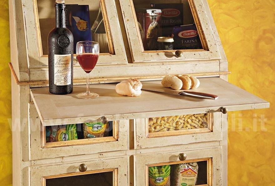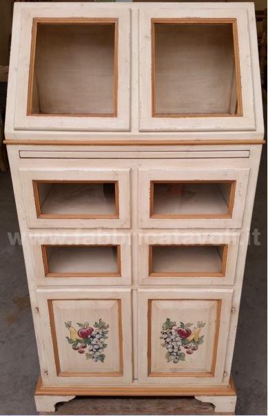 Dispensa da cucina in legno massello con 2 ante a ribalta nella parte superiore, 4 cassetti con frontale in vetro e 2 ante nella parte bassa. Da notare la particolarità del tiretto estraibile. Finitura laccata avorio anticato con profili ocra, arricchita da particolari decori floreali eseguiti a mano.