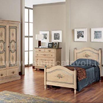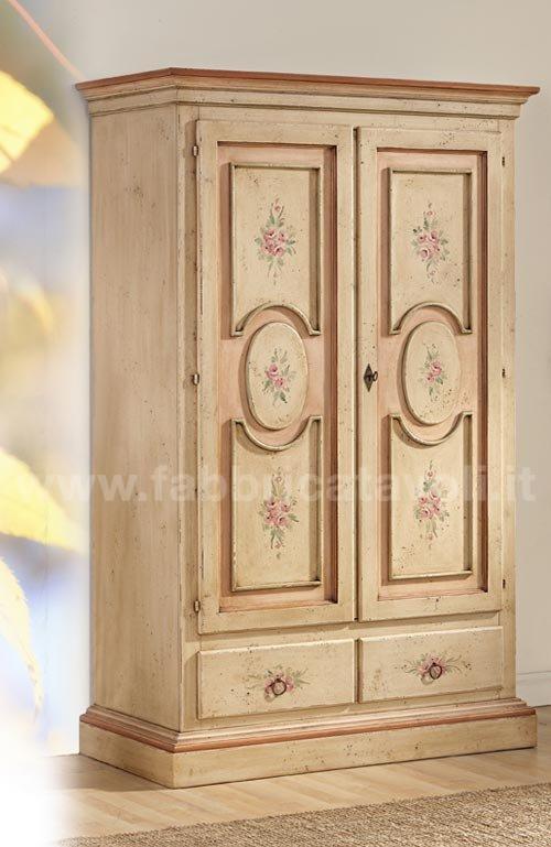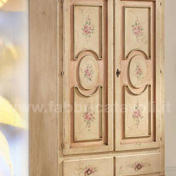 Armadio con 2 porte e 2 cassetti in legno massello. Finitura avorio anticato con profili rosa antico e arricchito da un particolare decoro di fiori.