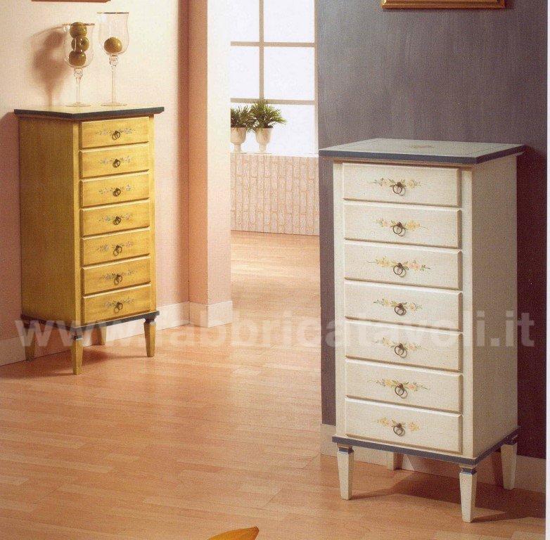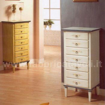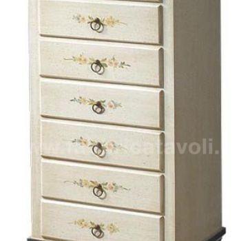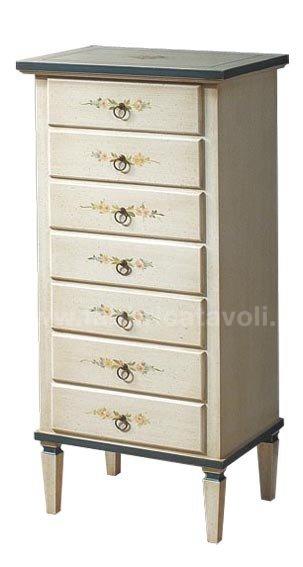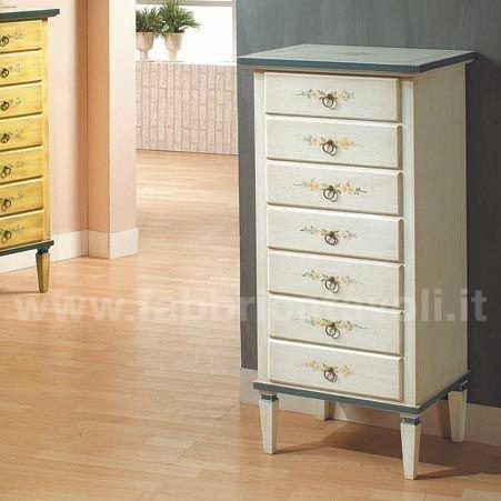 Cassettiera composta da 7 cassetti. Valorizzata dalla finitura bianco filo azzurro con graziosi decori floreali nella facciata frontale e in quella superiore.