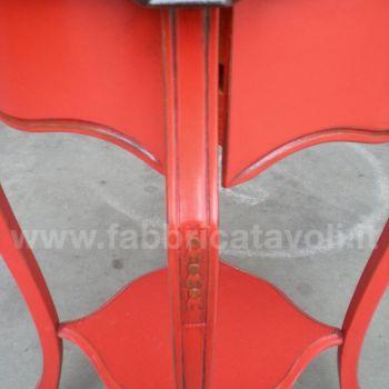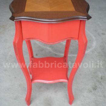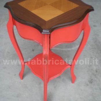 Tavolino in legno un cassetto, con finitura bicolore (top noce chiaro, base laccato rosso patinato).
