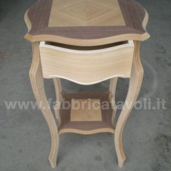 Il tavolino è realizzato con un cassetto frontale e gambe sagomate, intagliate, mentre il piano superiore è arricchito da un pregiato intarsio di noce e ciliegio.
