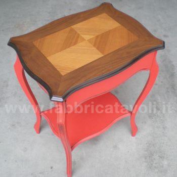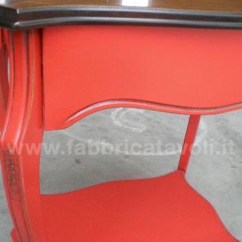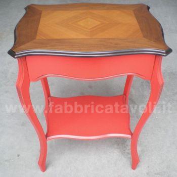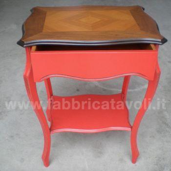 Tavolino in legno un cassetto, con finitura bicolore (top noce chiaro, base laccato rosso patinato).