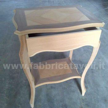 Il tavolino è realizzato con un cassetto frontale e gambe sagomate, intagliate, mentre il piano superiore è arricchito da un pregiato intarsio di noce e ciliegio.