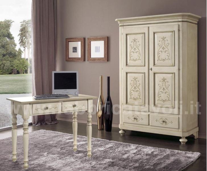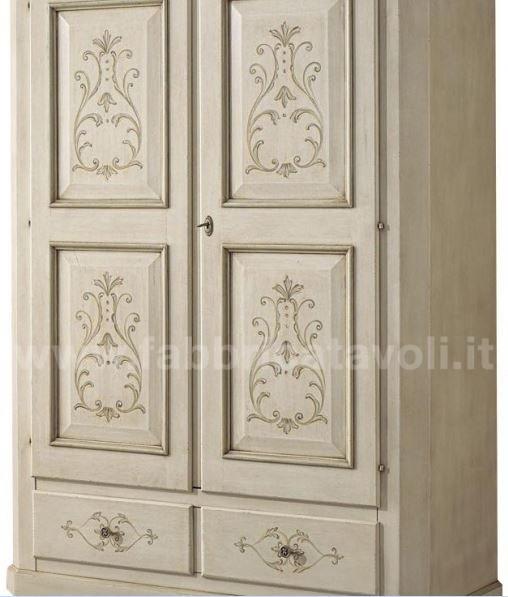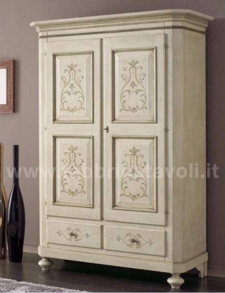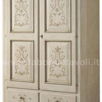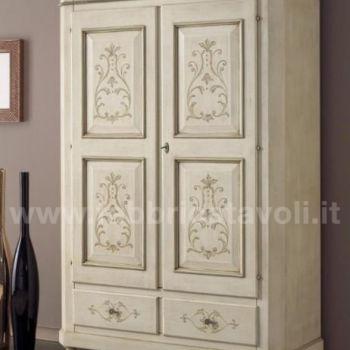 Armadio con 2 porte e 2 cassetti in legno massello. Finitura laccato avorio anticato profilo verde antico arricchita da disegni floreali di gusto classico.