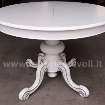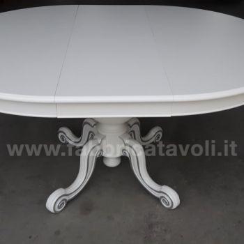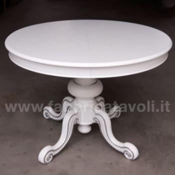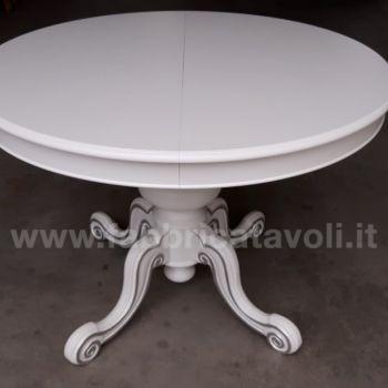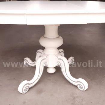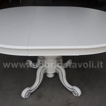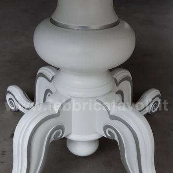 Tavolo rotondo allungabile diam.100 / 110 / 120 con apertura al centro, realizzato artigianalmente con finitura laccato bianco con profili in vera foglia argento. Allunga centrale da cm 40, il gambo centrale è tornito e intagliato.