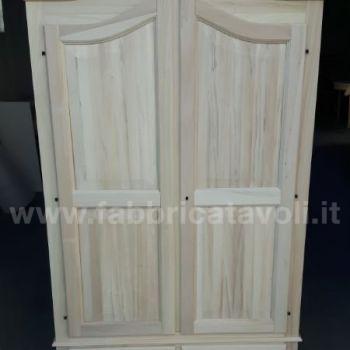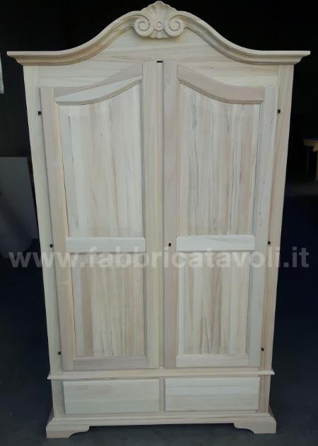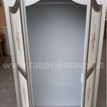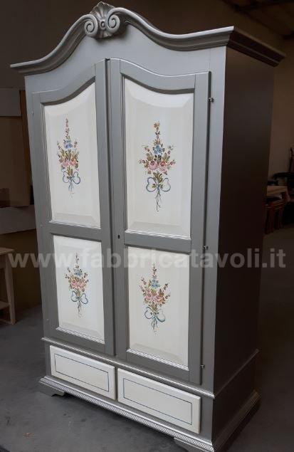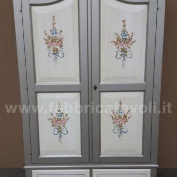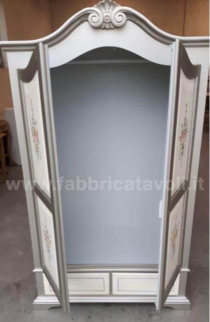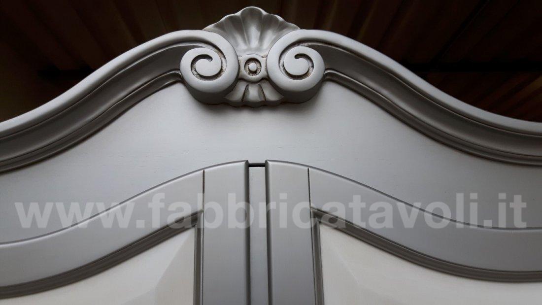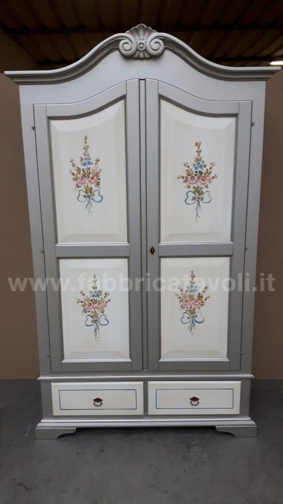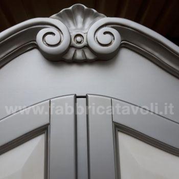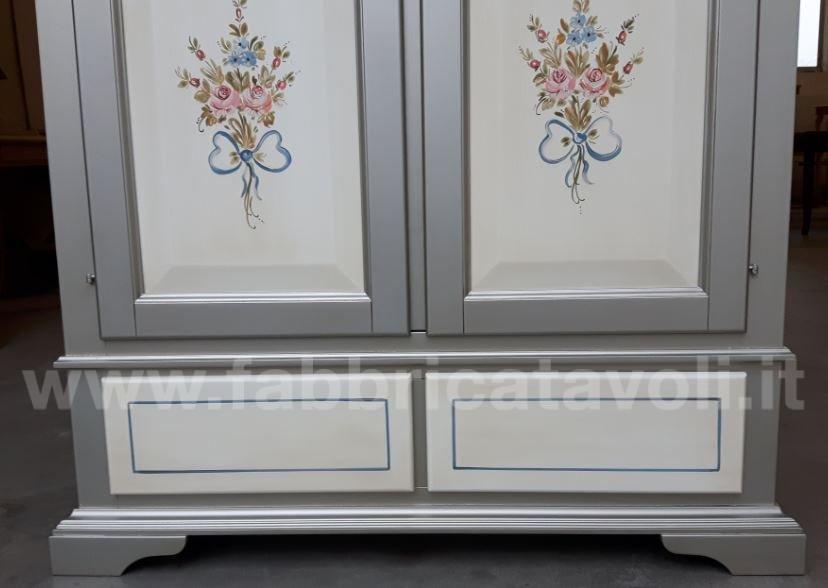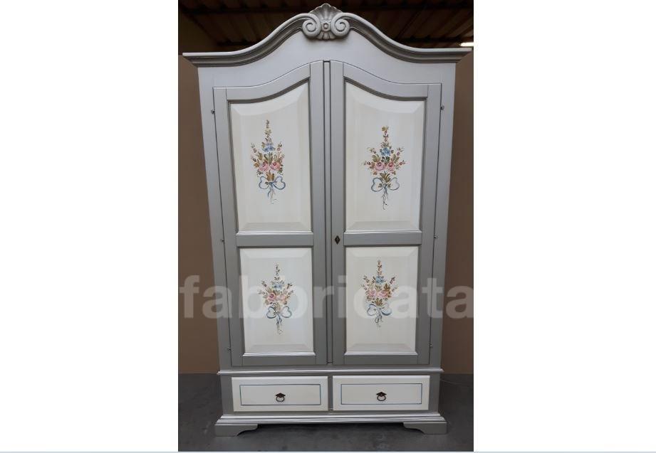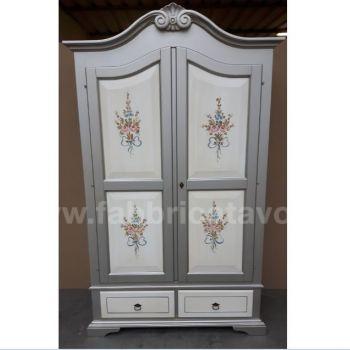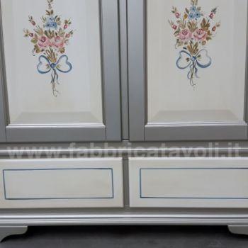 Armadio con 2 porte e 2 cassetti in legno massello con cornice intagliata nella parte alta a forma di conchiglia. Finitura argento con filetti azzurro e arricchito da dei graziosi decori di fiori tenuti da un nastrino.
