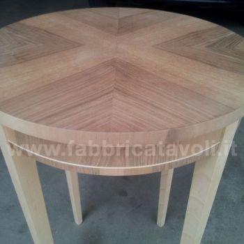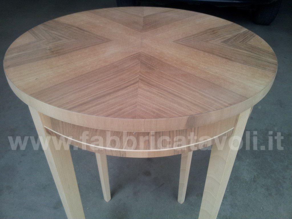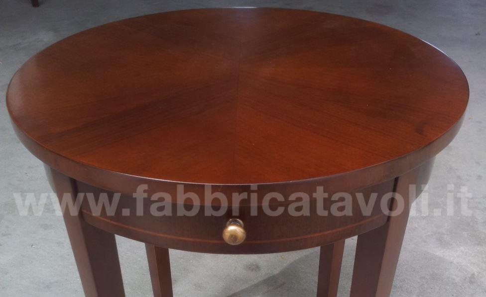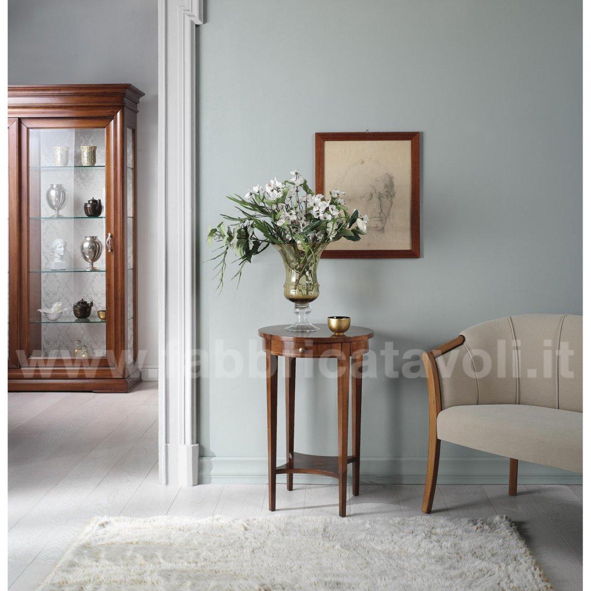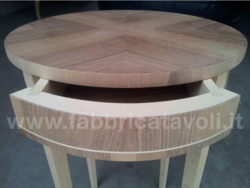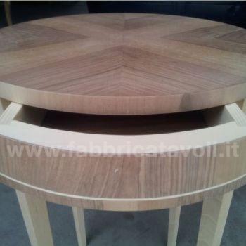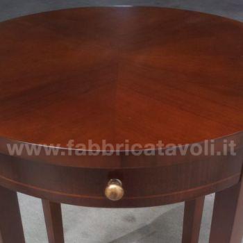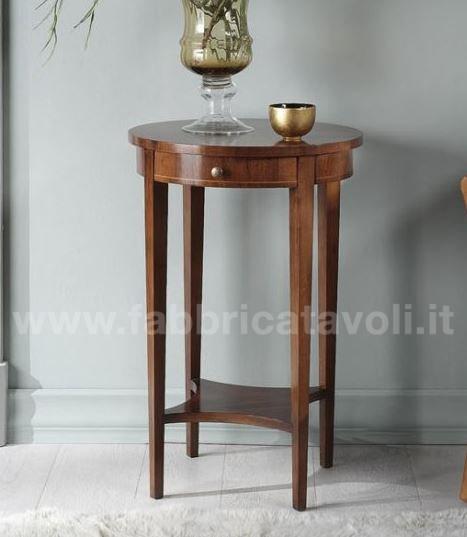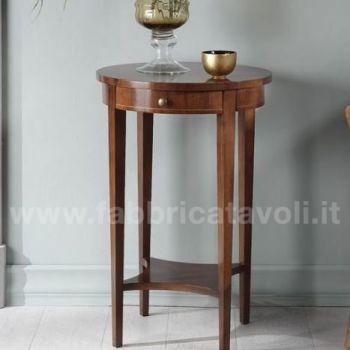 Tavolino rotondo 1 cassetto in noce intarsiato, con gambe a spillo che sorreggono un ripiano a lati sagomati.