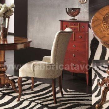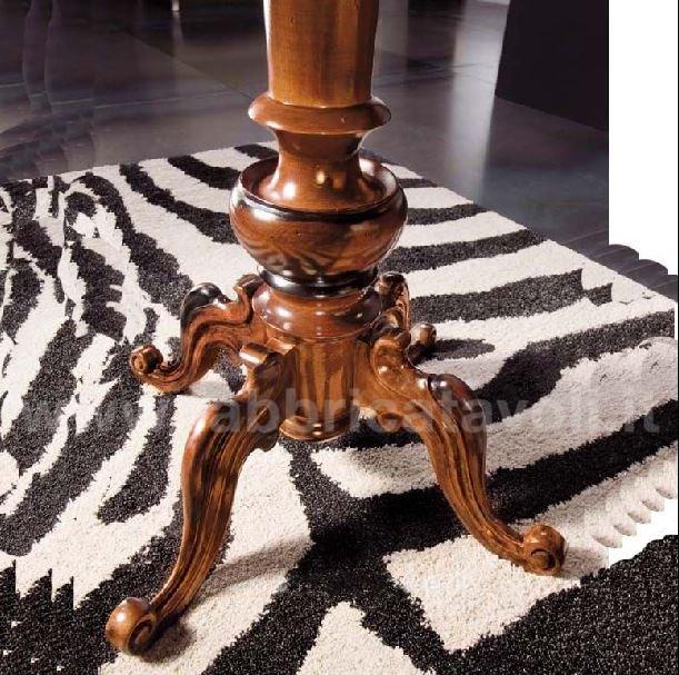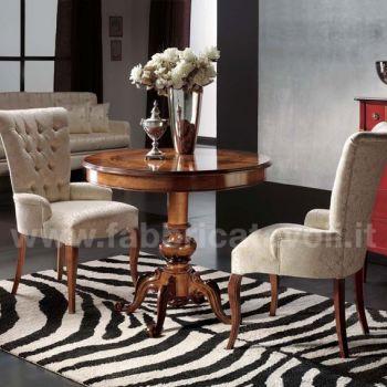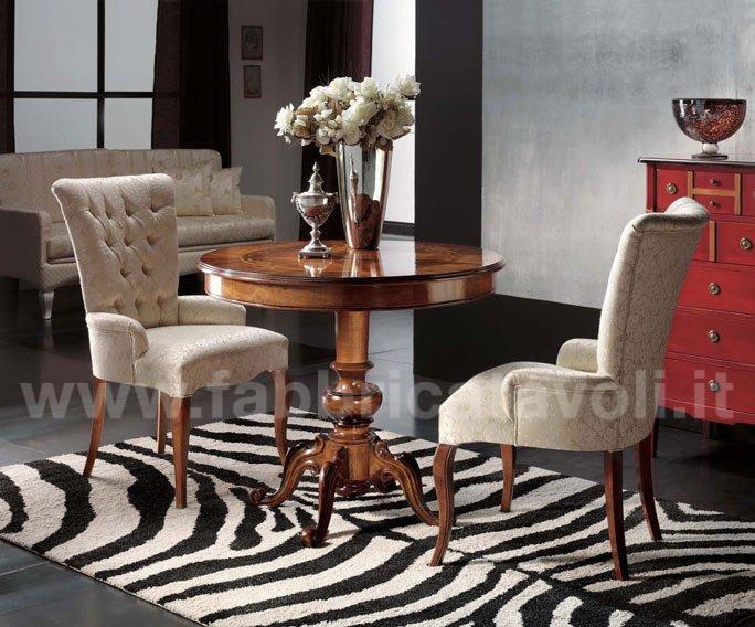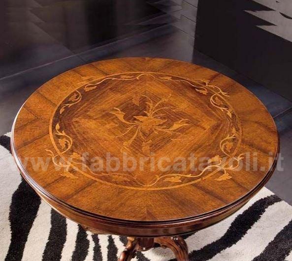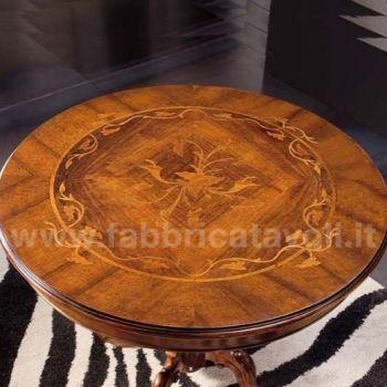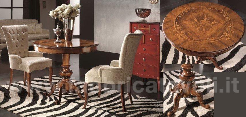 Tavolino rotondo intarsiato in legno. Un tavolo di alta qualità con gambo tornito in legno.