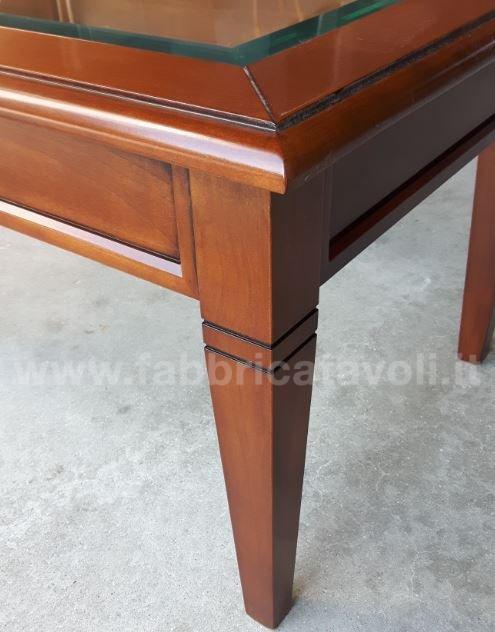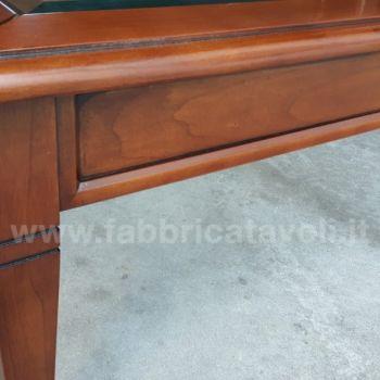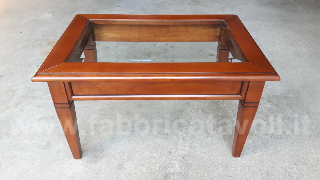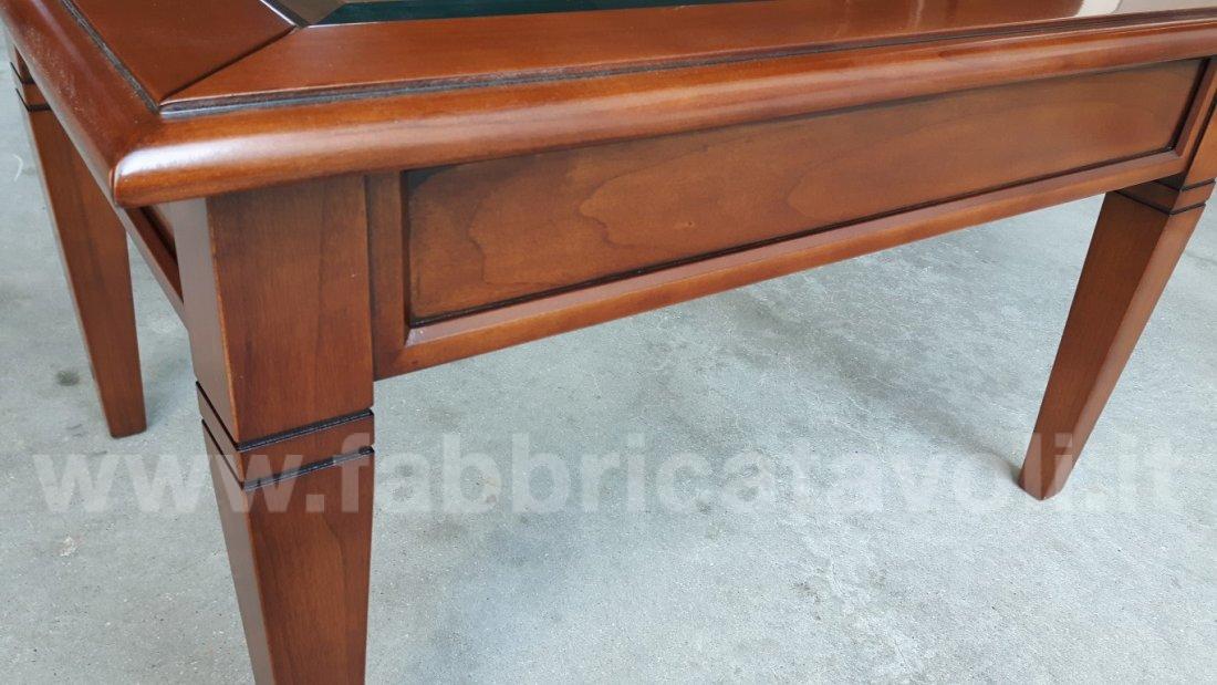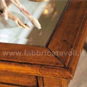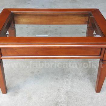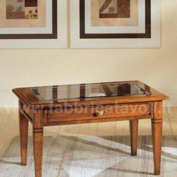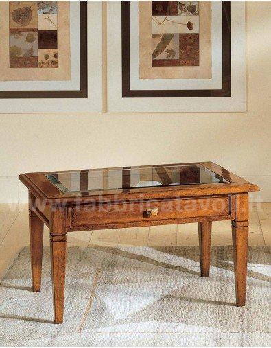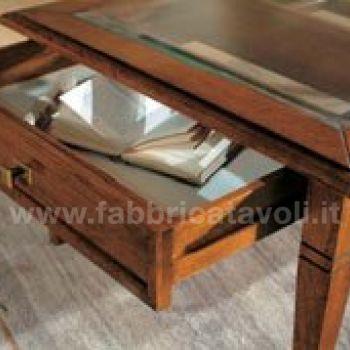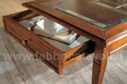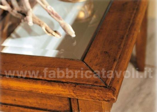Tavolino rettangolare massello con un cassetto. Piano con inserito un vetro che permette la visione degli oggetti inseriti nel cassetto, il vetro è trasparente e molato.
