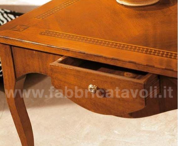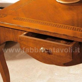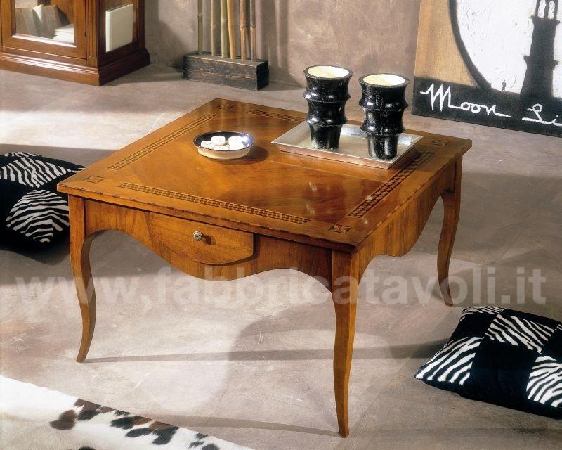 Tavolino da salotto quadrato con cassetto. Piano intarsiato con filettature lavorate a motivi geometrici.