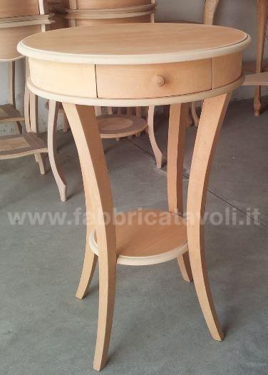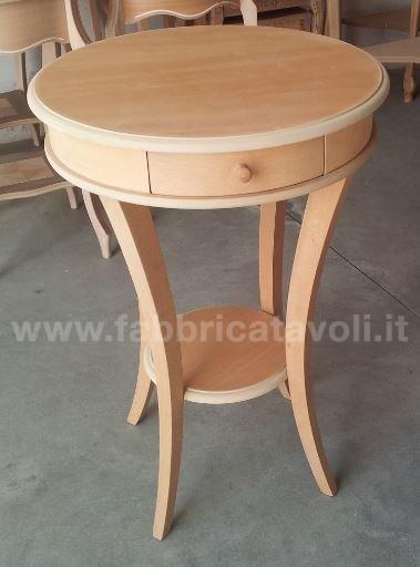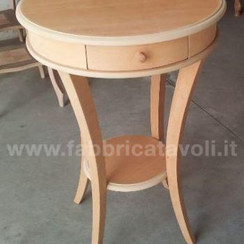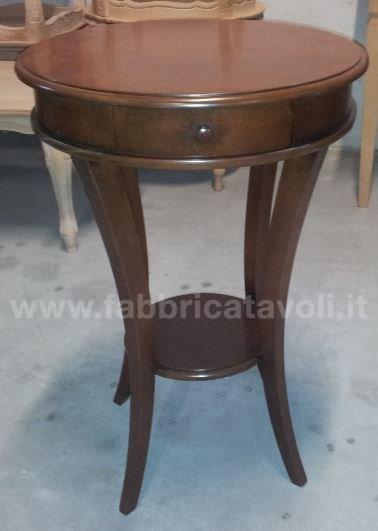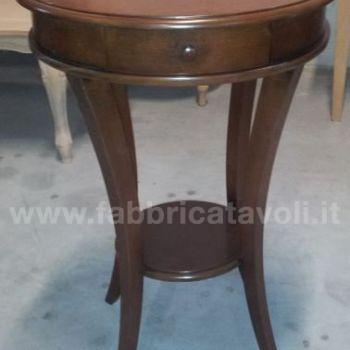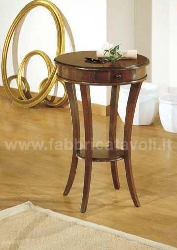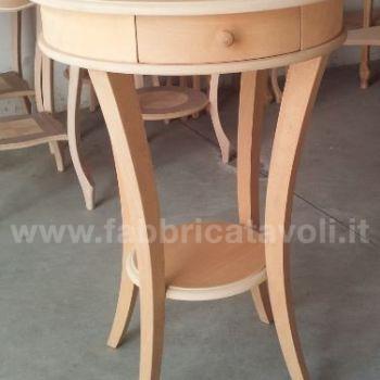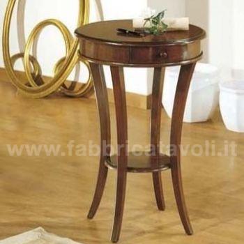 Tavolino rotondo con cassettino. Le gambe riprendono una curvatura sagomata e sostengono un ripiano nella parte bassa.