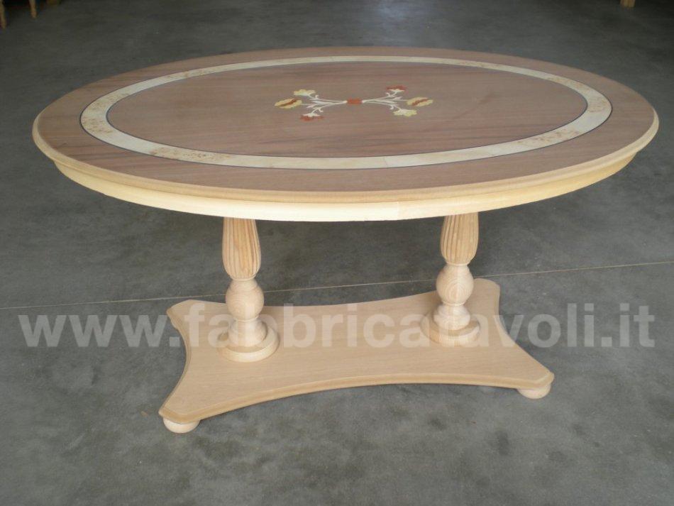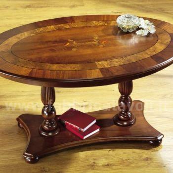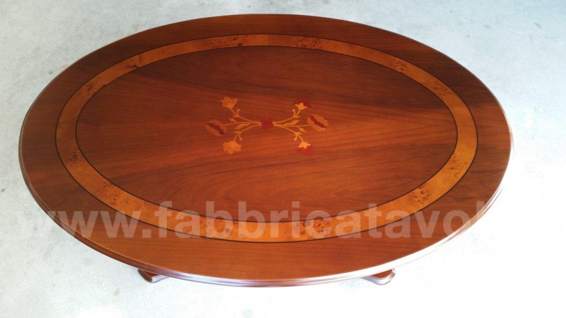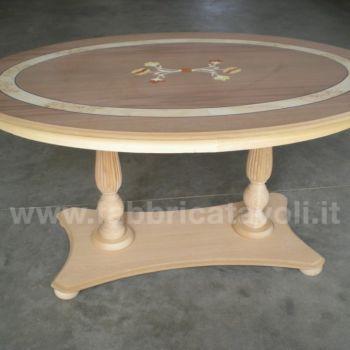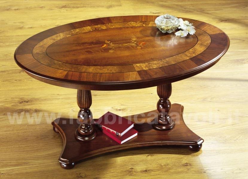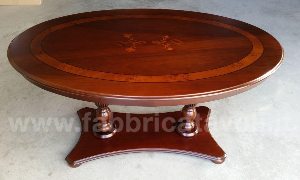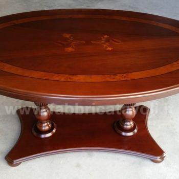 Tavolino ovale in legno intarsiato con 2 gambe centrali zigrinate.