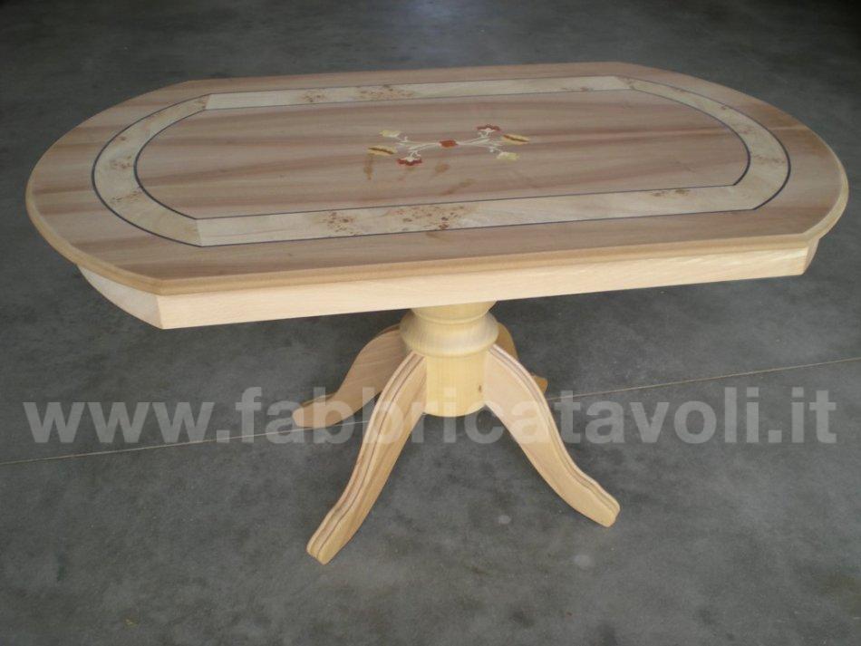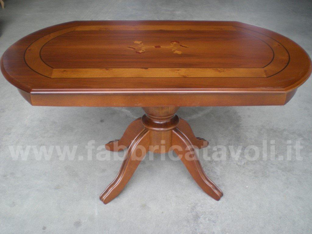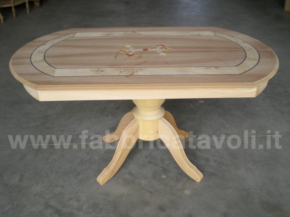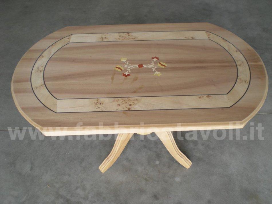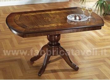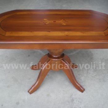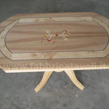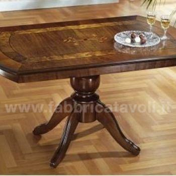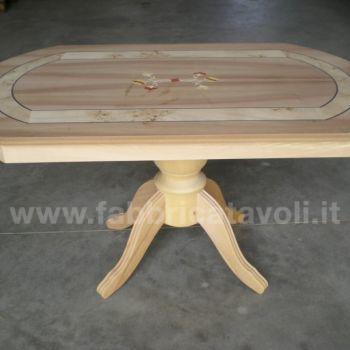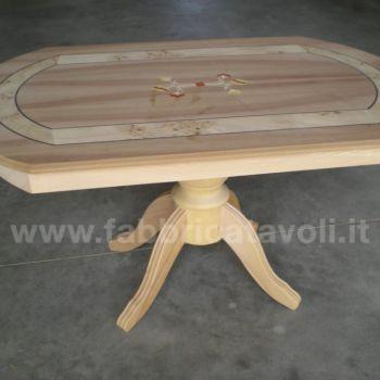Tavolino rettangolare con gambo centrale e con intarsio in legno.