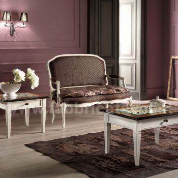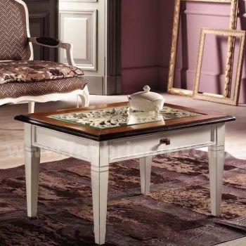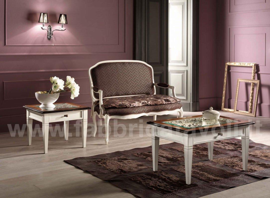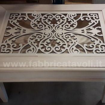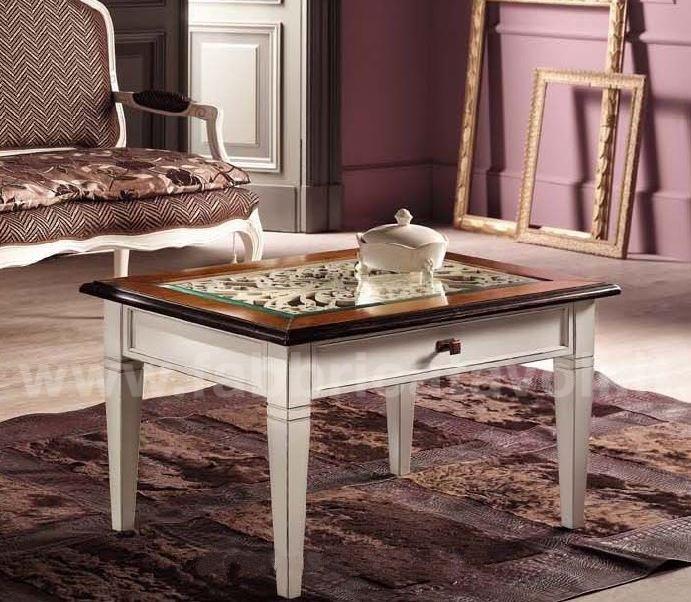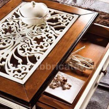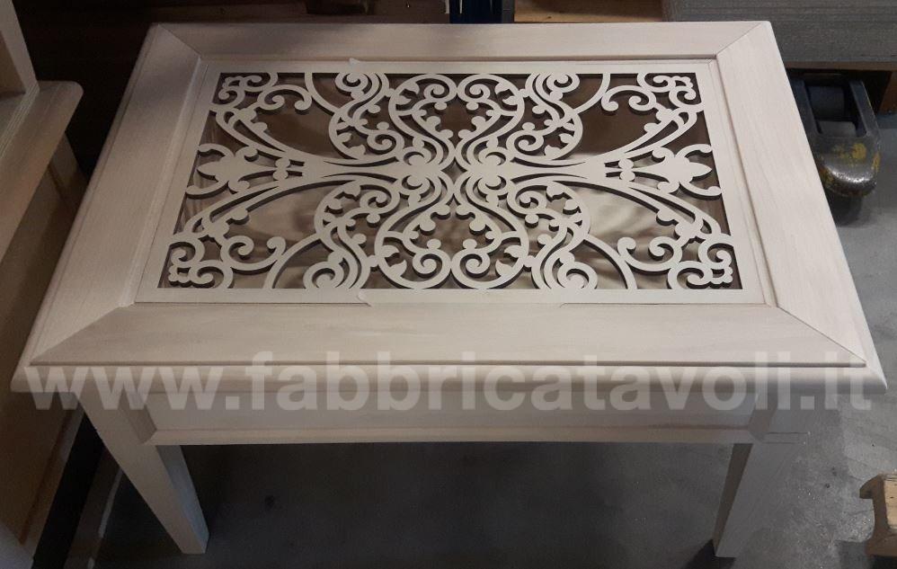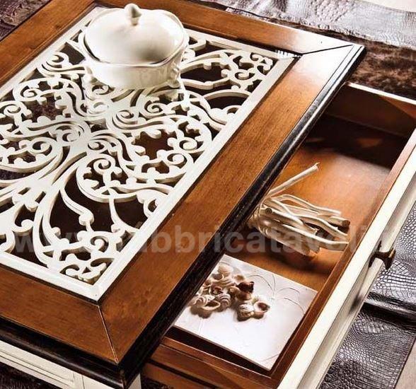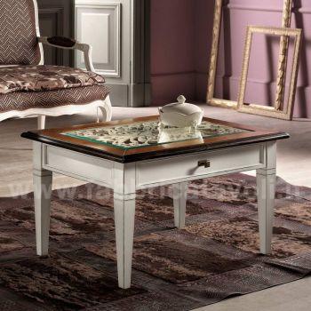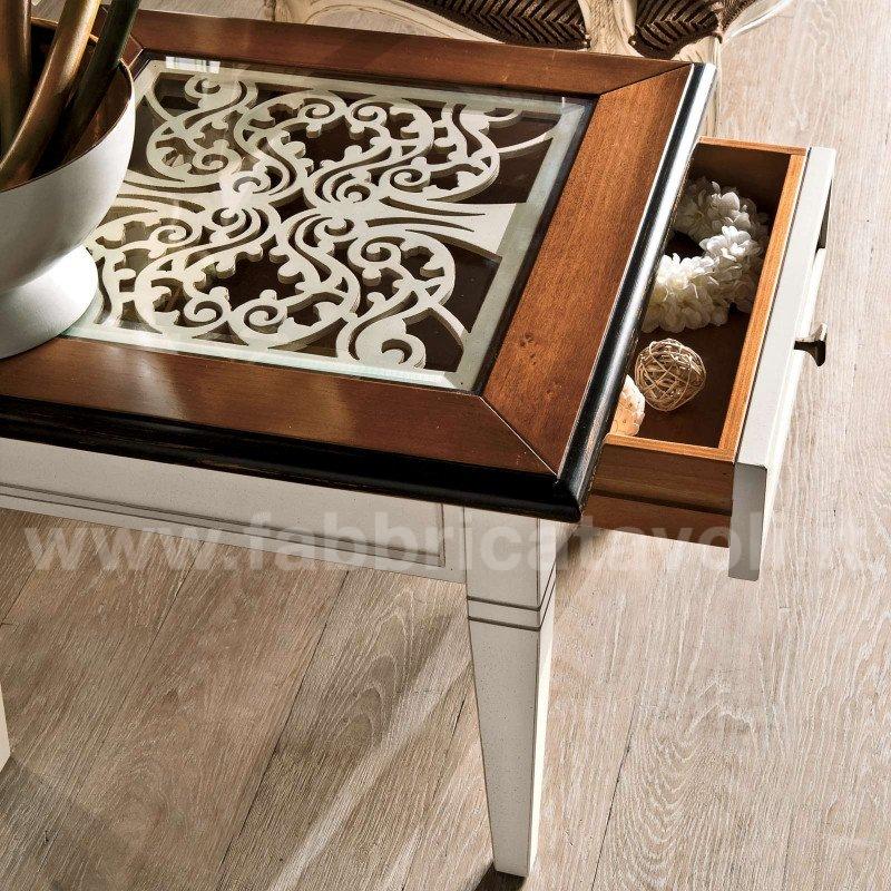 Tavolino quadrato con cassetto piano in vetro e traforatura interna sotto il vetro.
