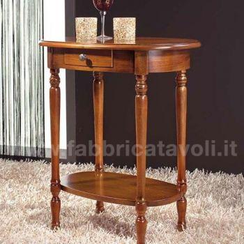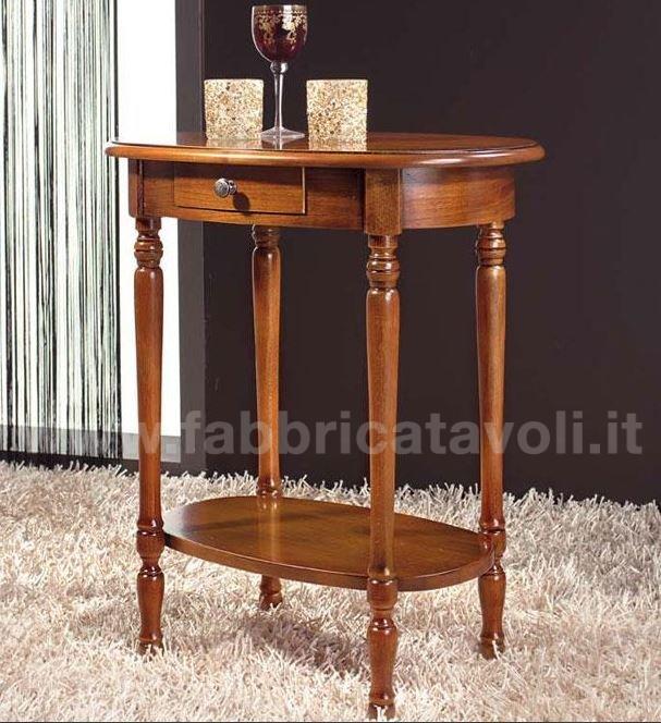 Tavolino ovale con un cassetto e ripiano inferiore, la struttura è realizzata in legno di faggio.