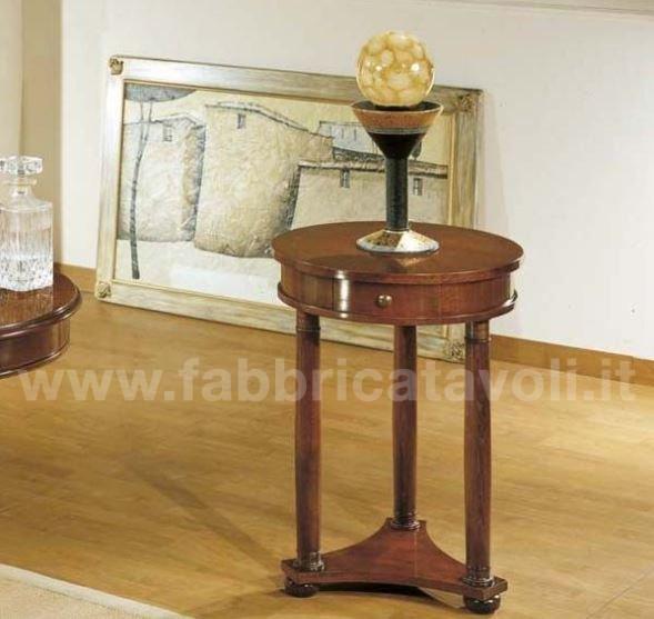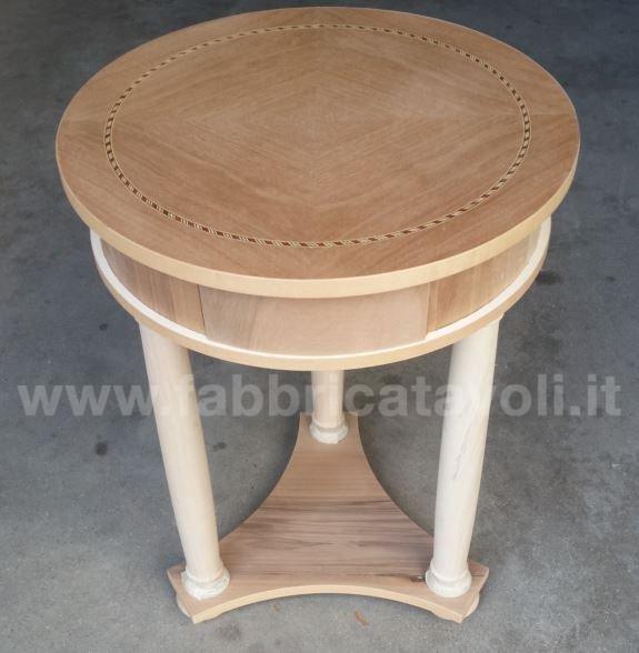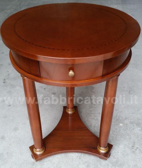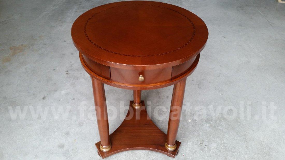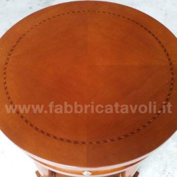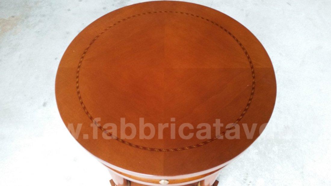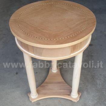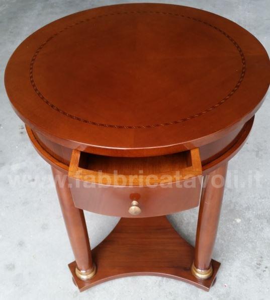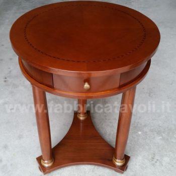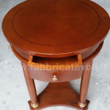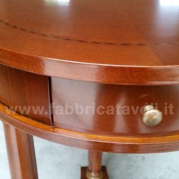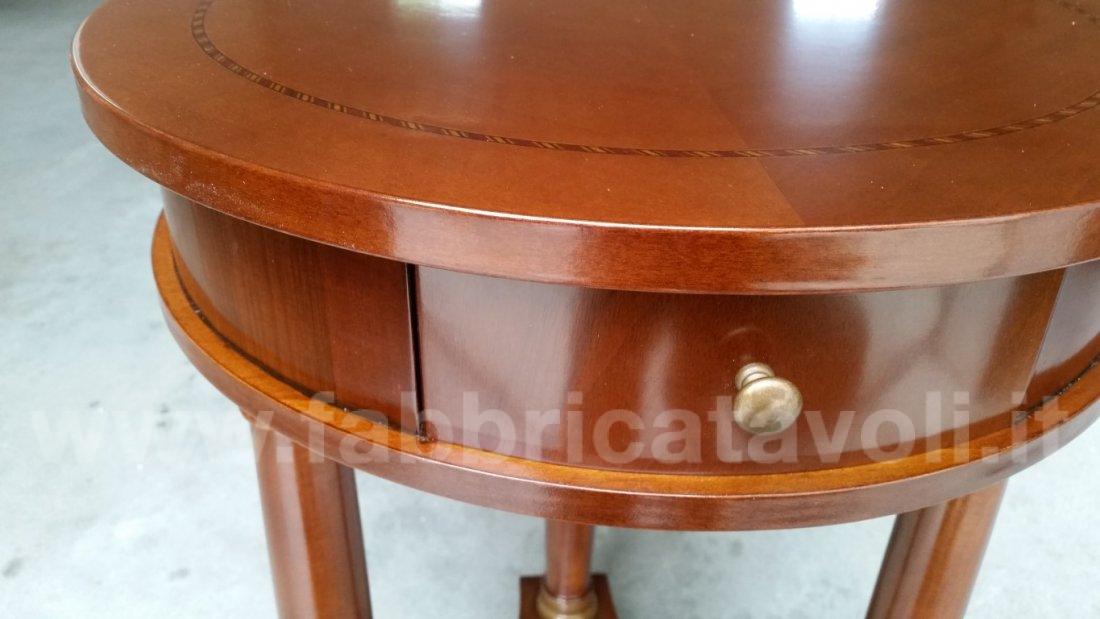 Tavolino rotondo intarsiato in legno diametro 50 con 1 cassetto inserito nella fascia.