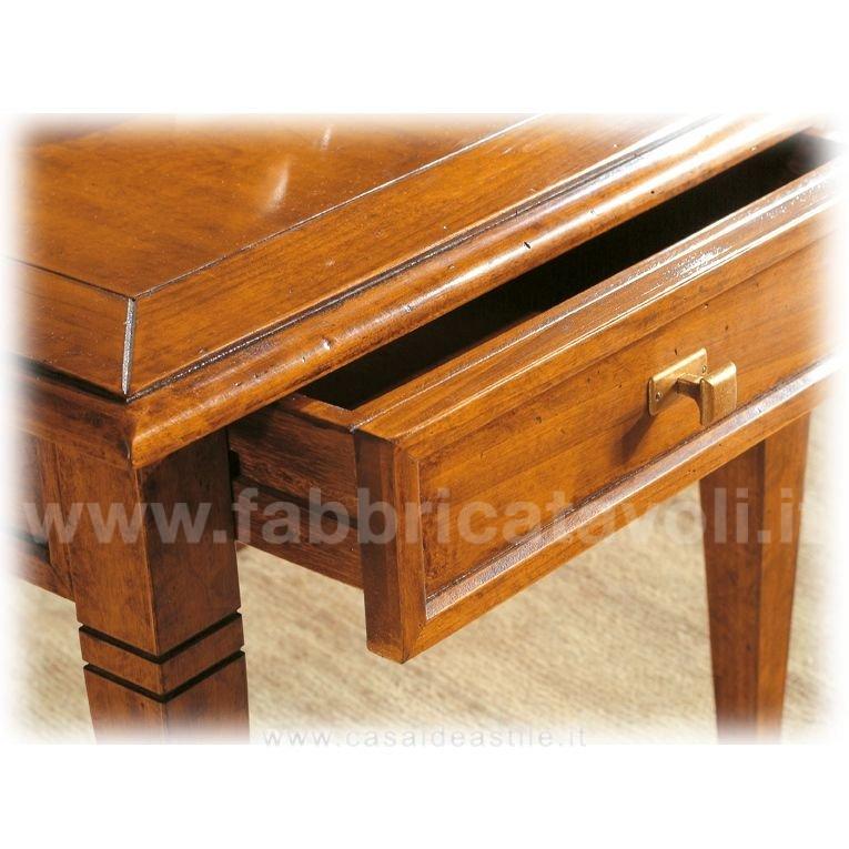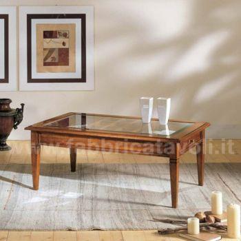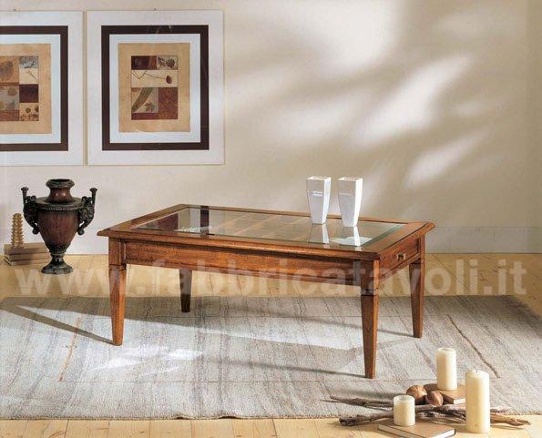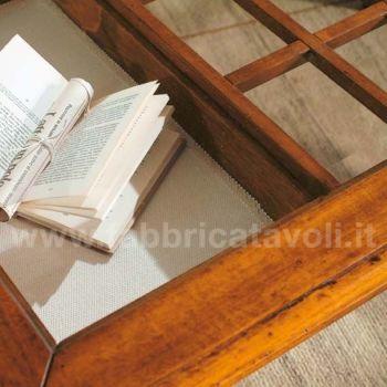 Tavolino rettangolare massello con griglia e cassetti. Piano con inserito un vetro che permette la visione degli oggetti inseriti nei cassetti, il vetro è trasparente e molato.