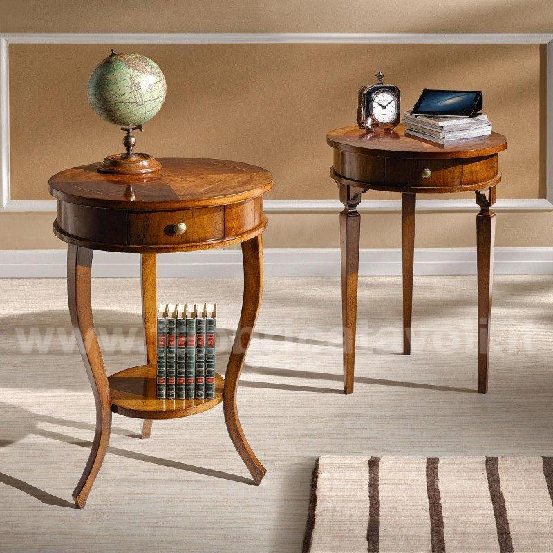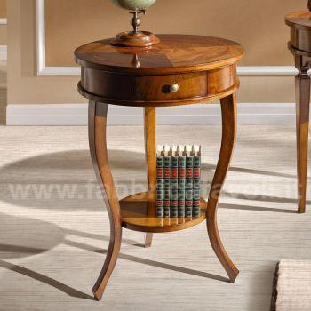 Tavolino rotondo diametro 50 piano intarsiato, con al centro 1 cassetto inserito nella fascia.