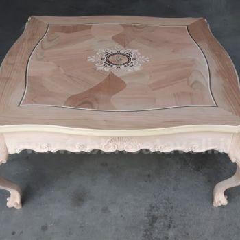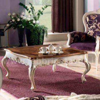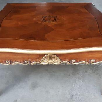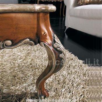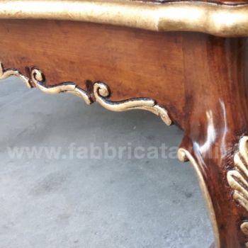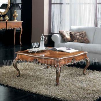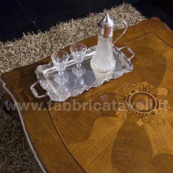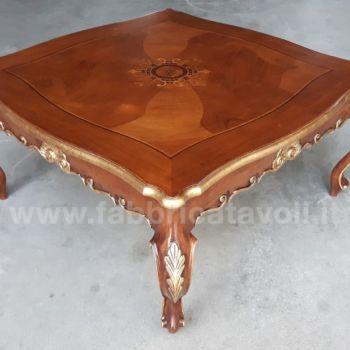 Tavolino da salotto barocco con piano intarsiato a motivi floreali, il basamento e le gambe sono riccamente intagliate a mano.