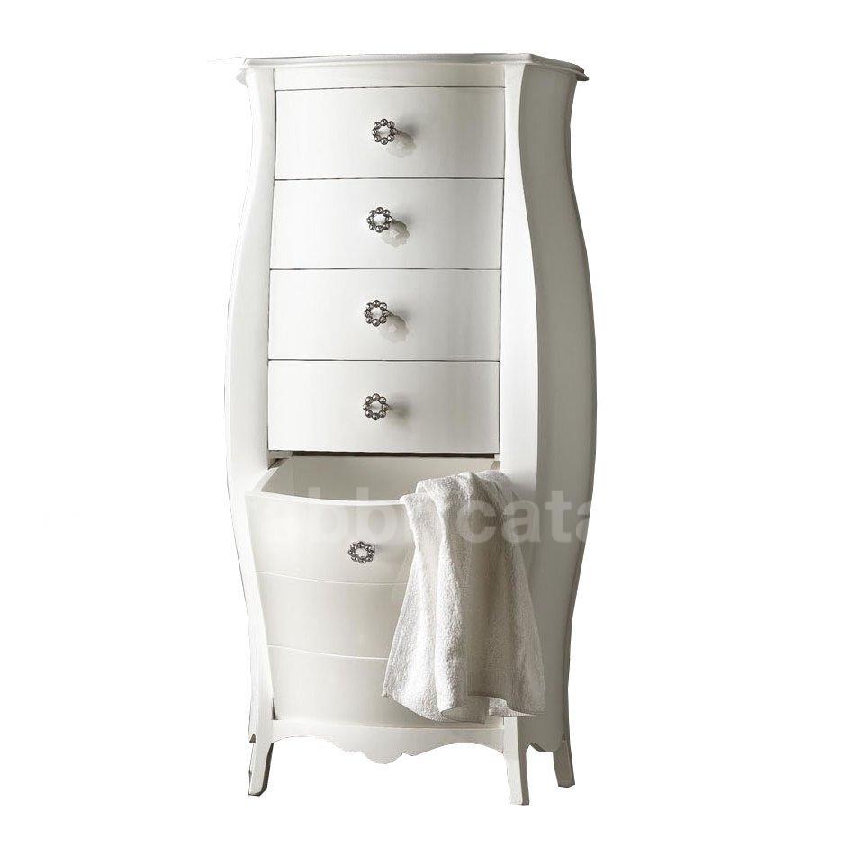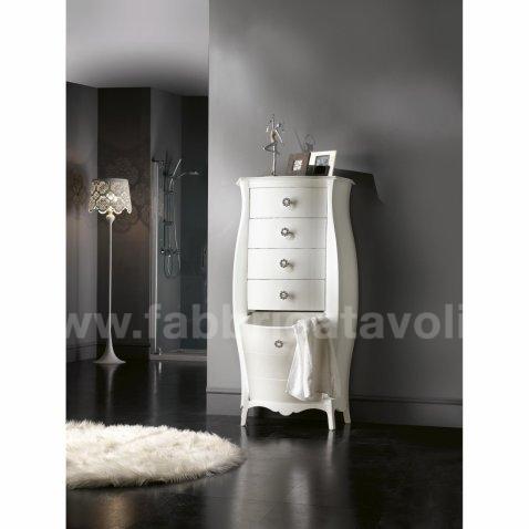 Cassettiera 4 cassetti con un contenitore a ribalta. Finitura laccato colore bianco con effetto madreperla.