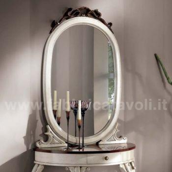 Specchiera ovale intagliata. La parte superiore riporta una bella conchiglia intagliata a mano.