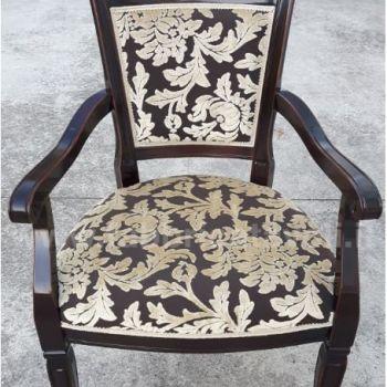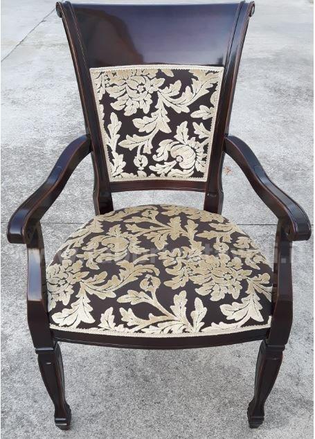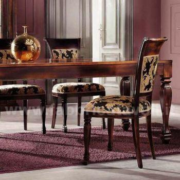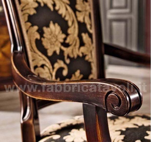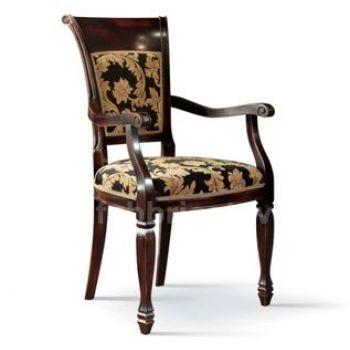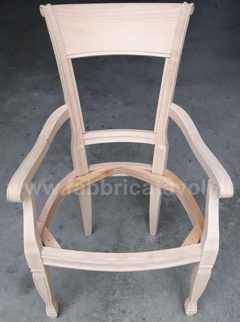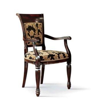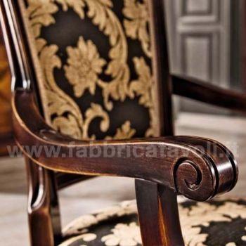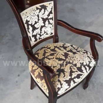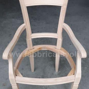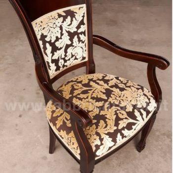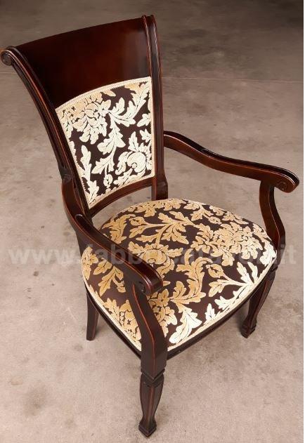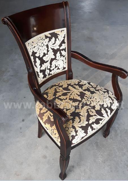 Sedia capotavola realizzata in legno massello di faggio e gamba anteriore a mongolfiera, la seduta e schienale sono imbottiti e rivestiti in tessuto.