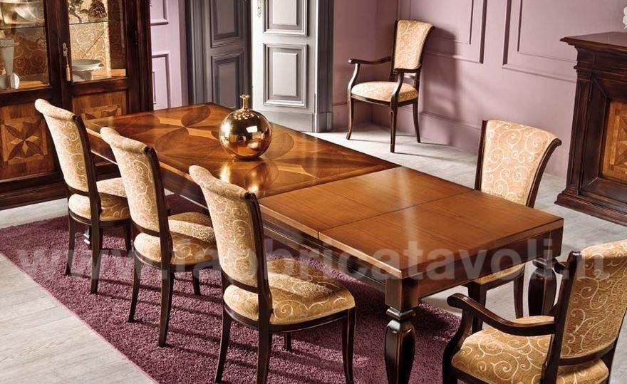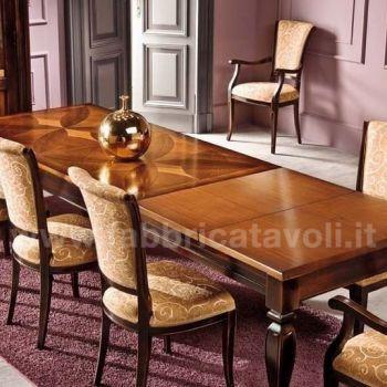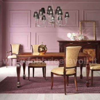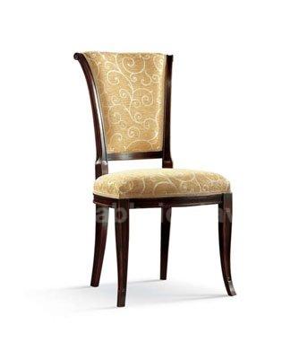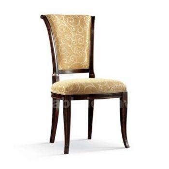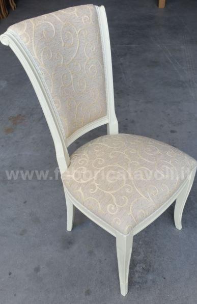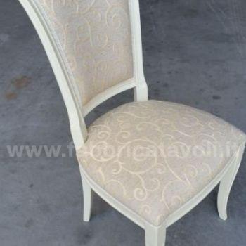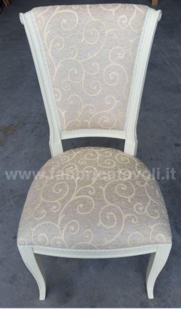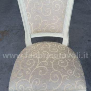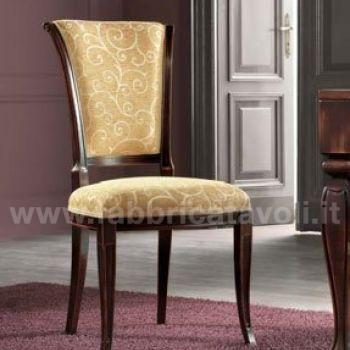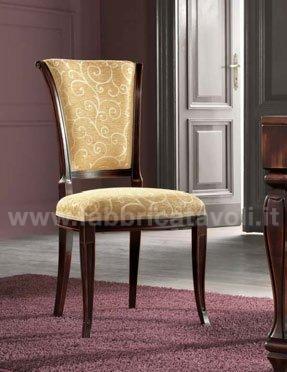 Sedia in faggio con seduta e schienale imbottiti e rivestiti in tessuto.