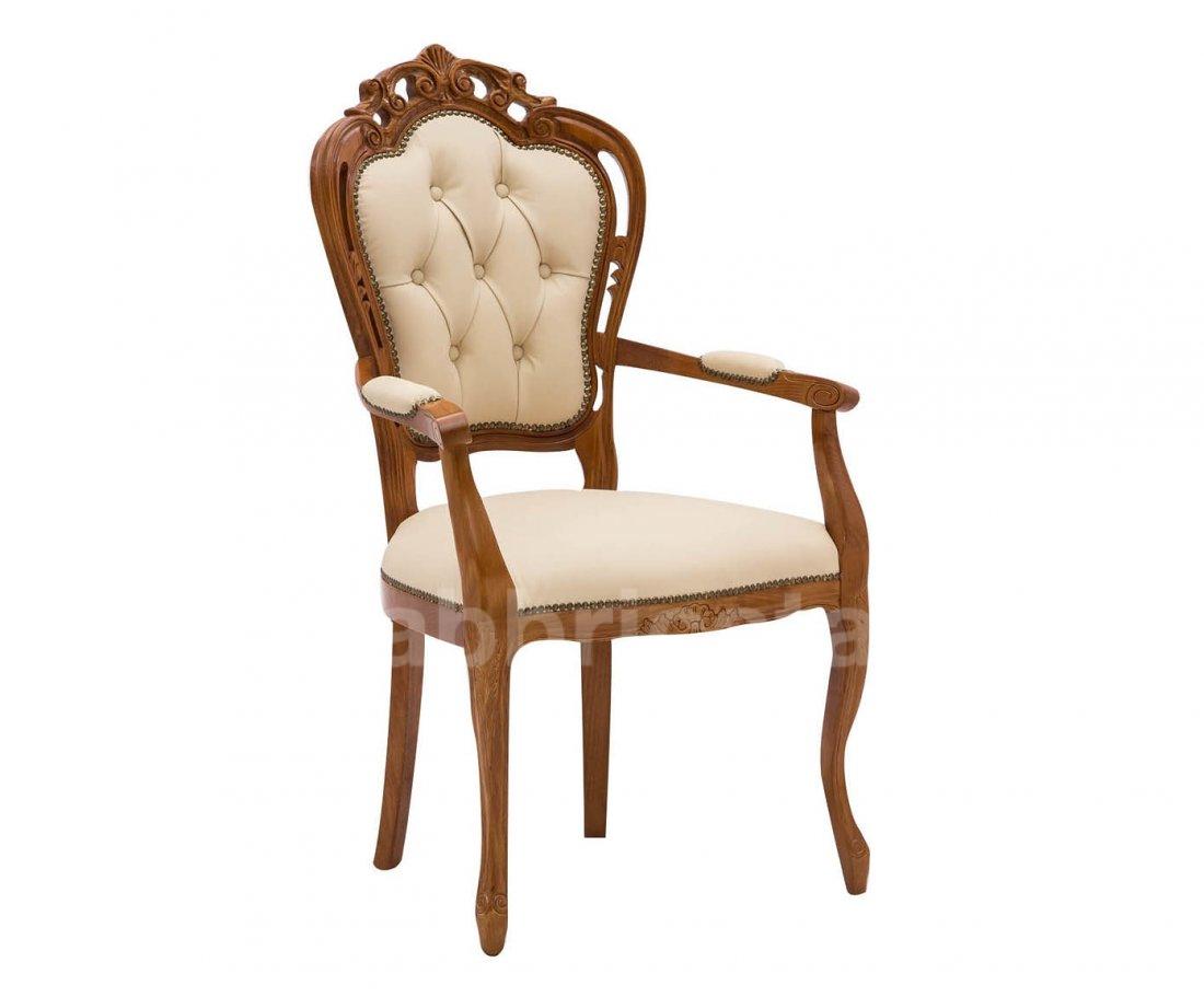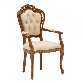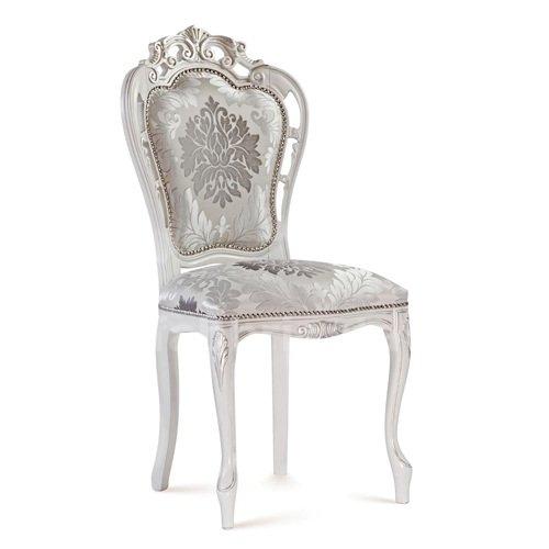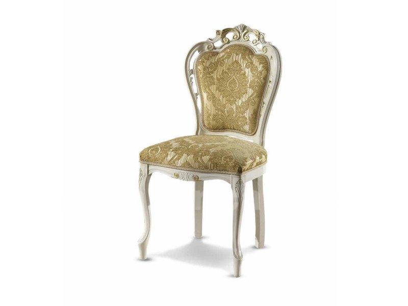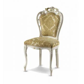 Sedia in faggio, con seduta e schienale imbottito. La sedia è valorizzata da pregiate lavorazioni di intaglio realizzato a mano.