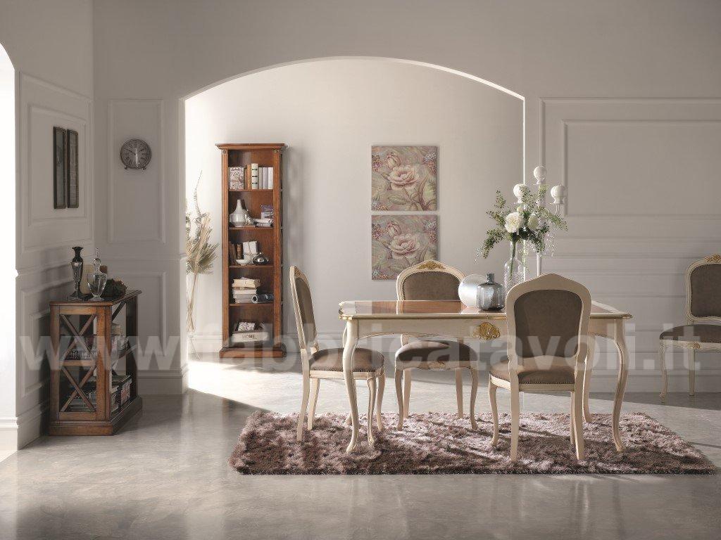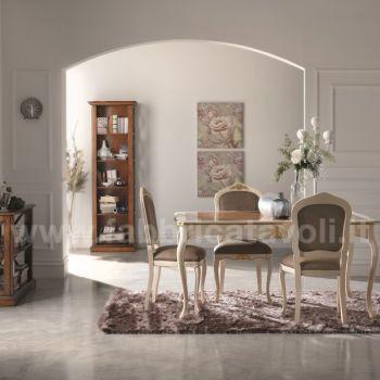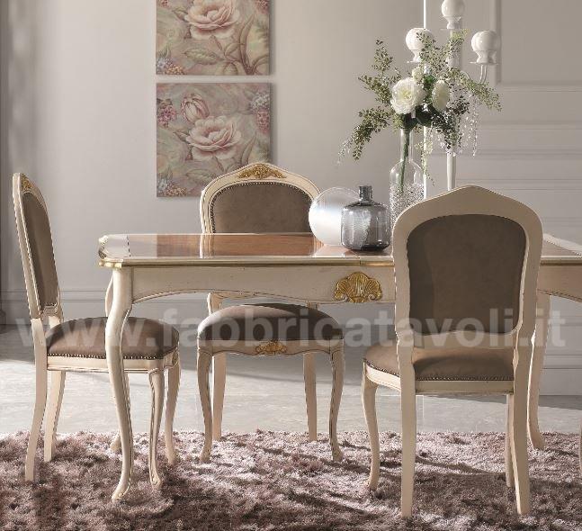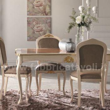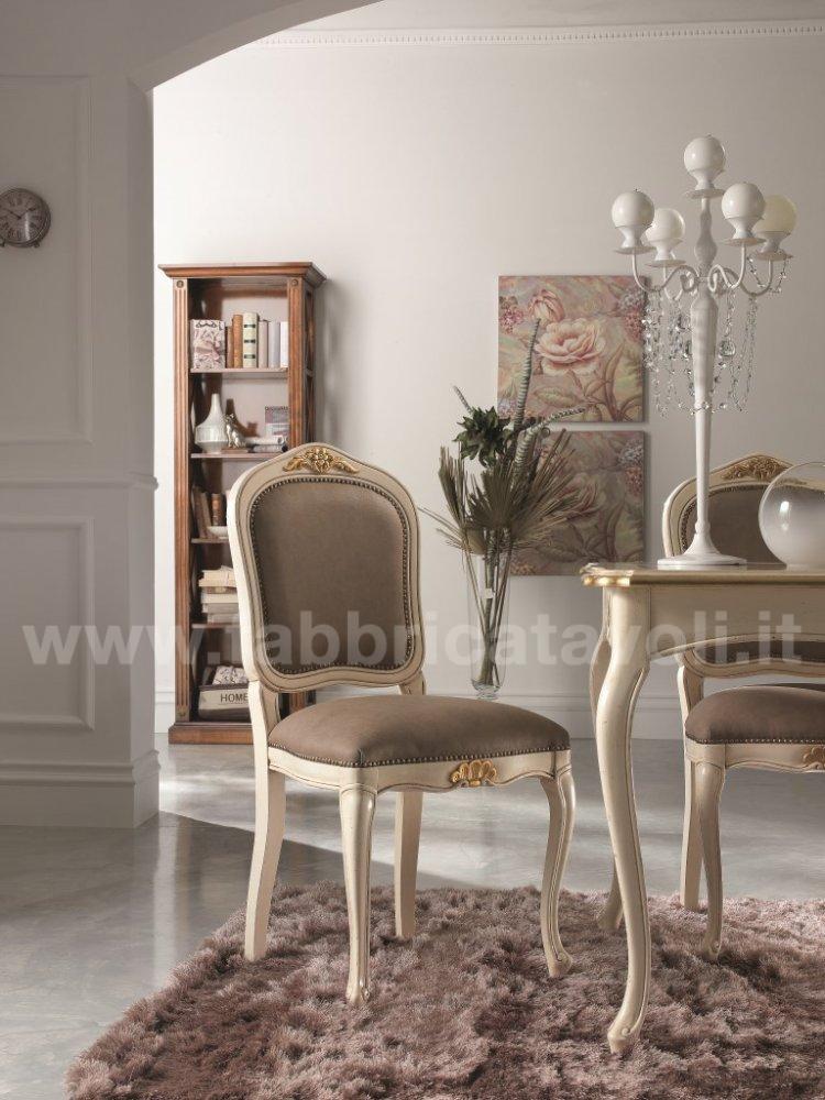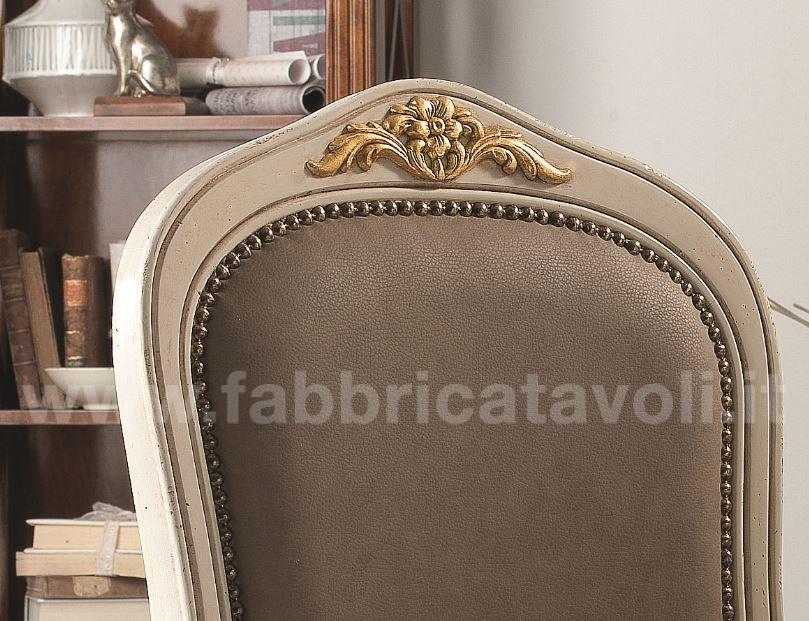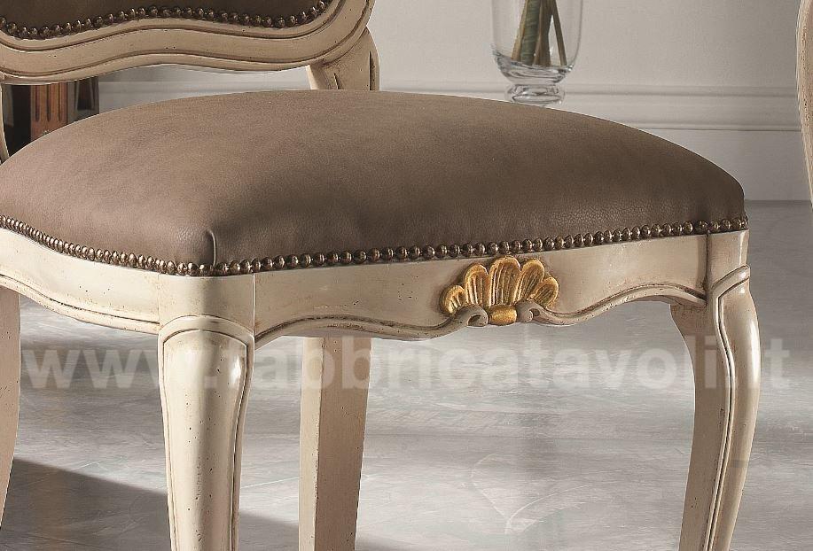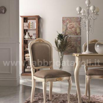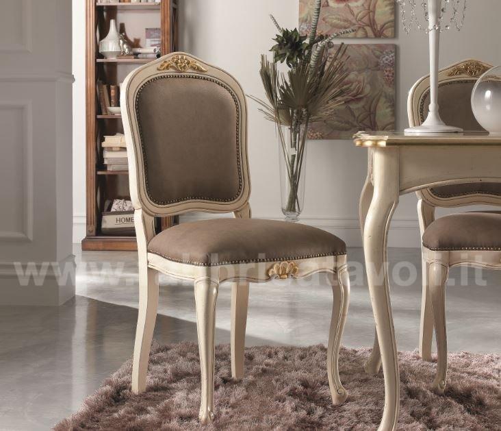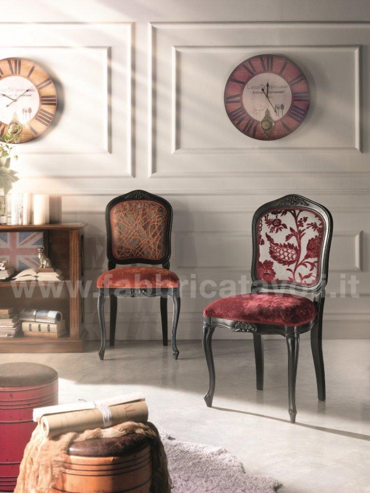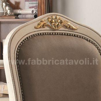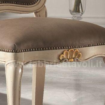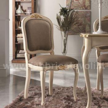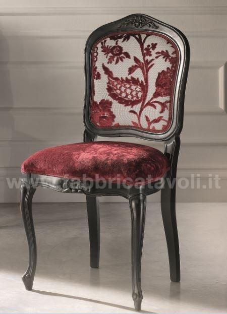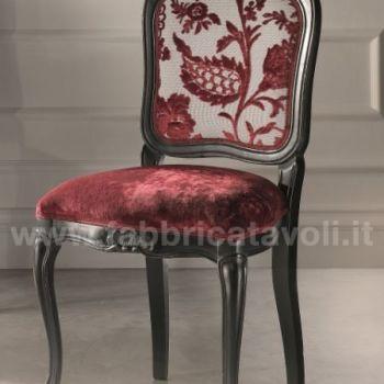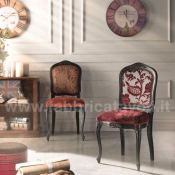 Sedia in faggio con seduta e schienale imbottiti e rivestiti in tessuto, nella parte alta dello schienale e la facciata anteriore sono arricchite da un intaglio eseguito a mano.