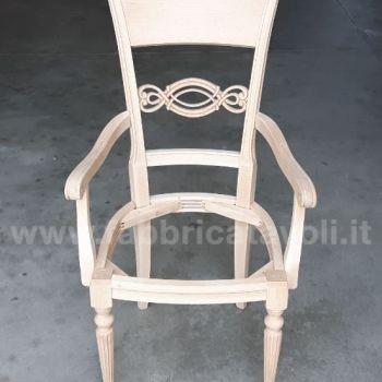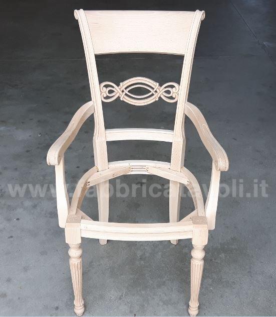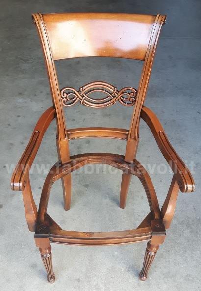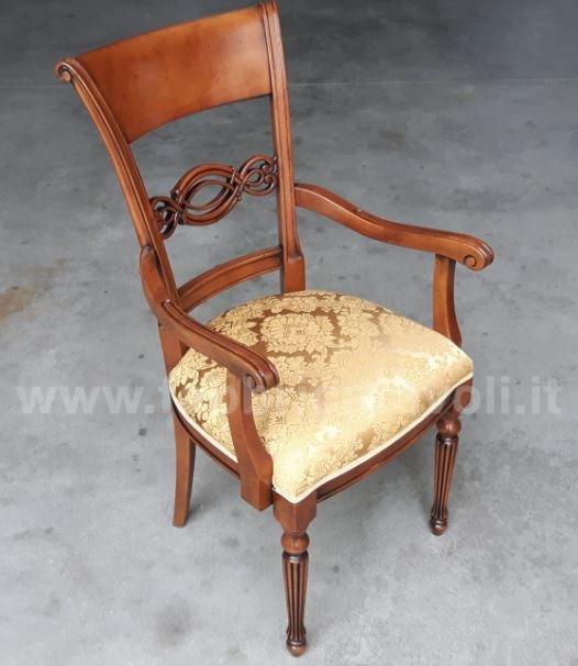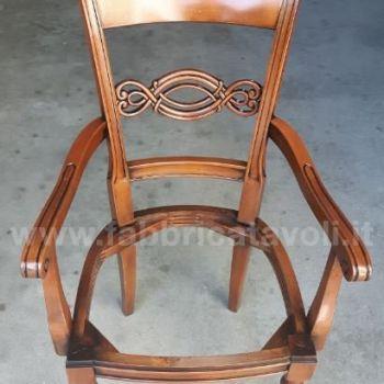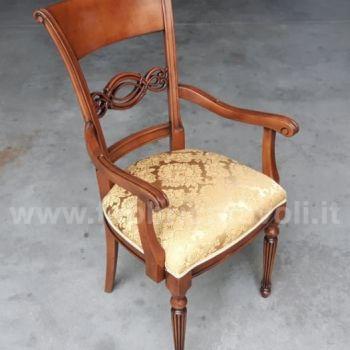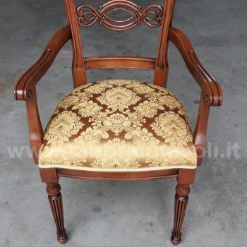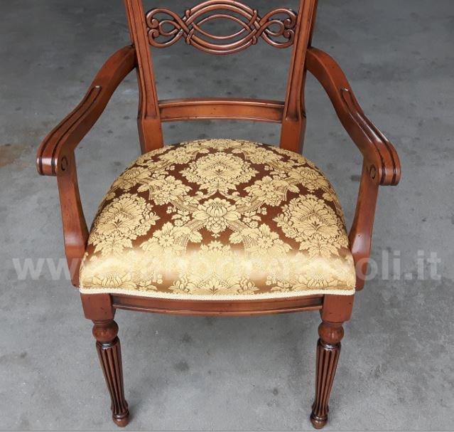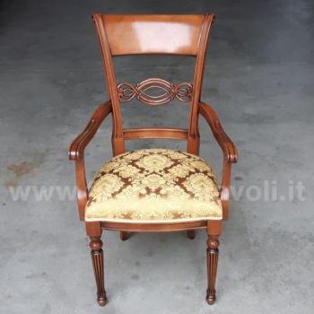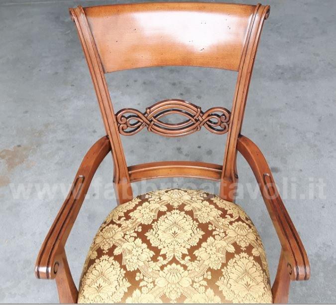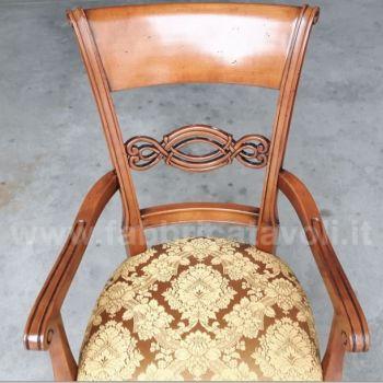 Sedia capotavola realizzata in legno massello di faggio, con seduta rivestita in tessuto e lo schienale intrecciato.