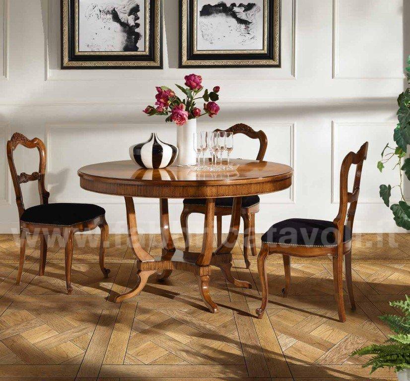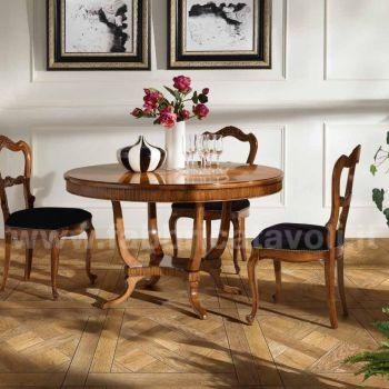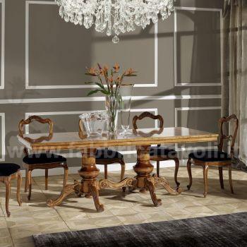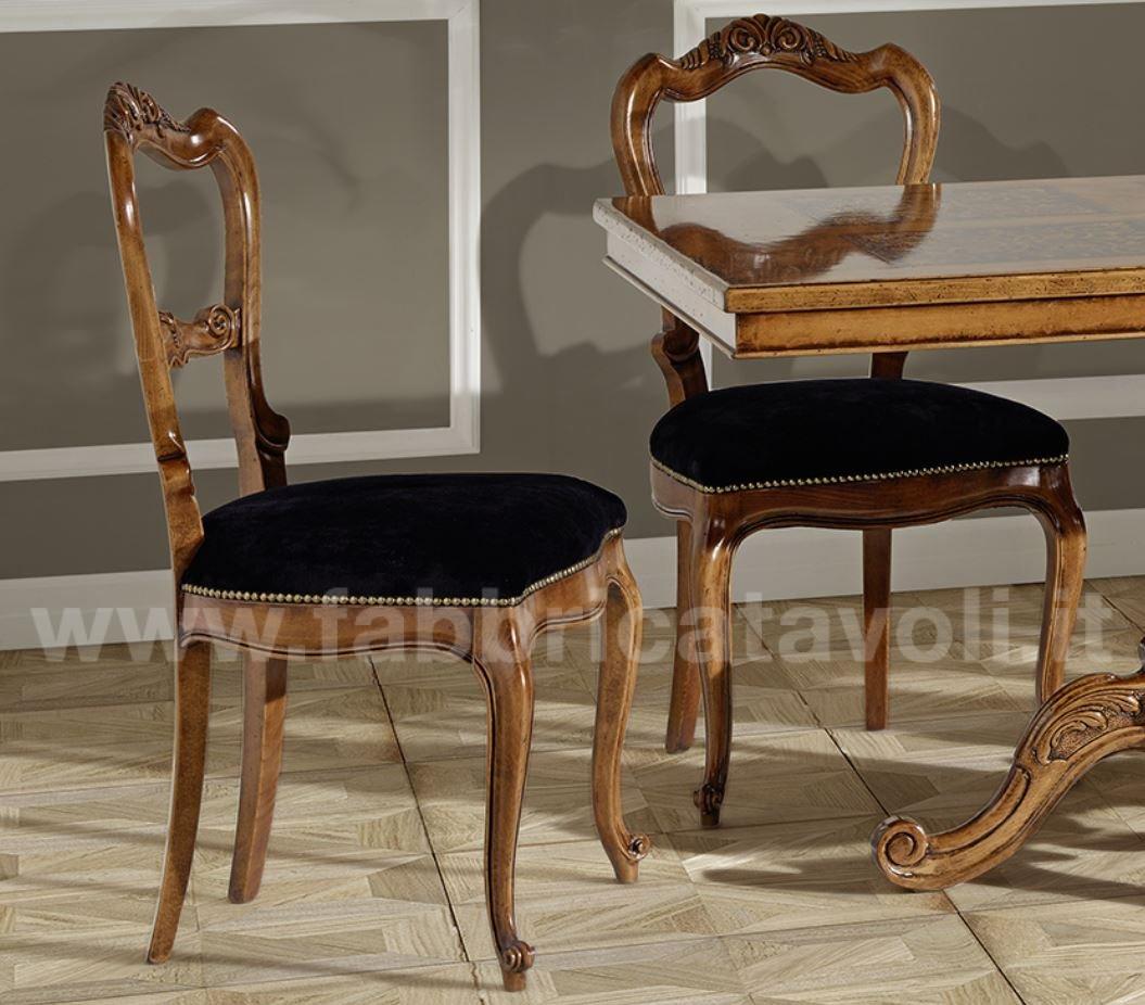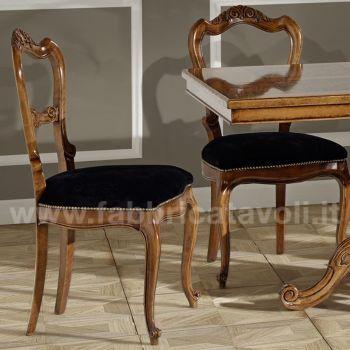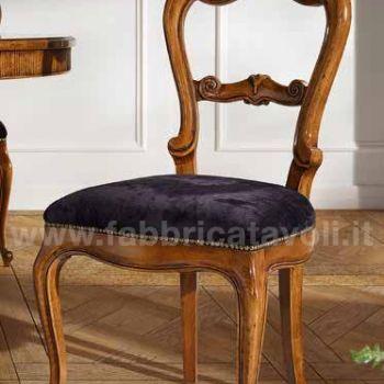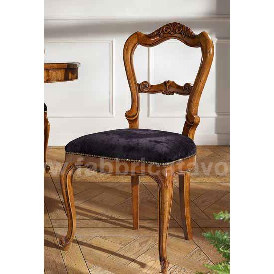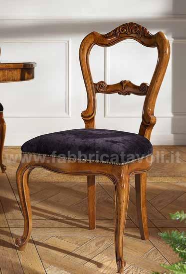 Sedia in faggio, con seduta imbottita. La sedia è valorizzata da pregiate lavorazioni di intaglio realizzato a mano.