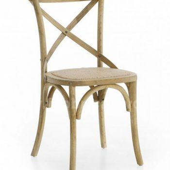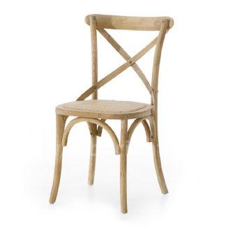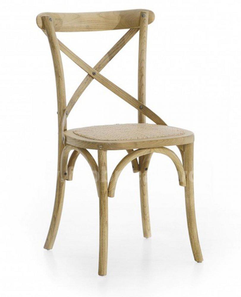 Sedia in legno massello di olmo con seduta rattan naturale intrecciato e schienale incrociato il tutto con finitura naturale. La realizzazione è con il metodo tradizionale artigianale della curvatura al vapore.