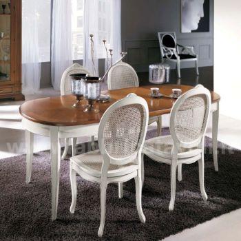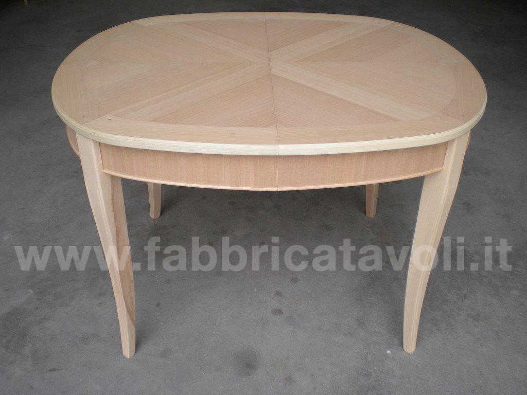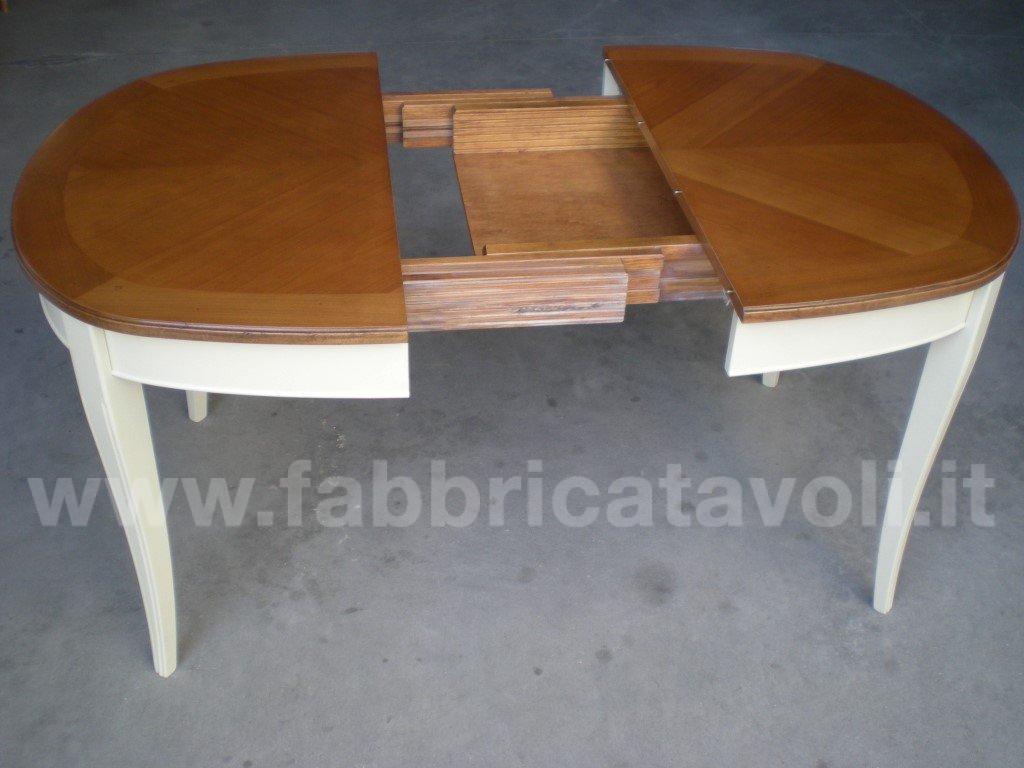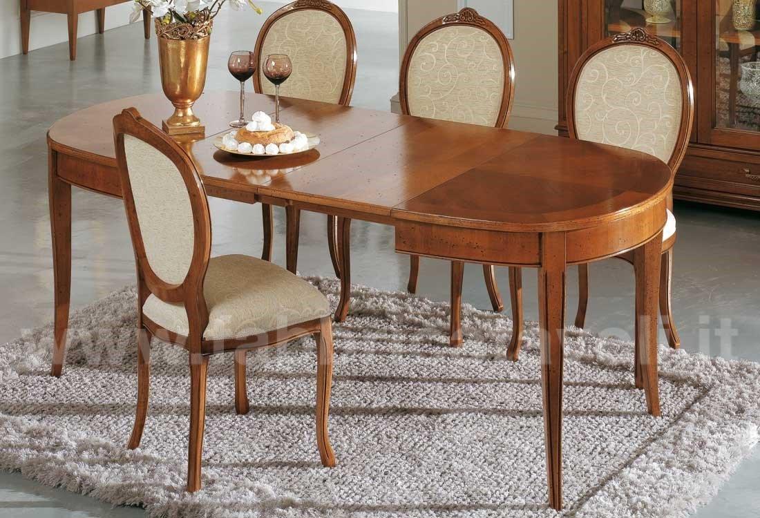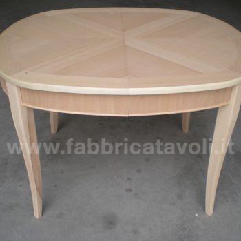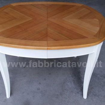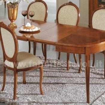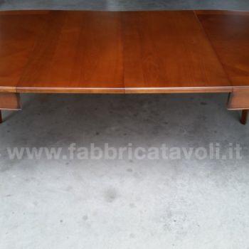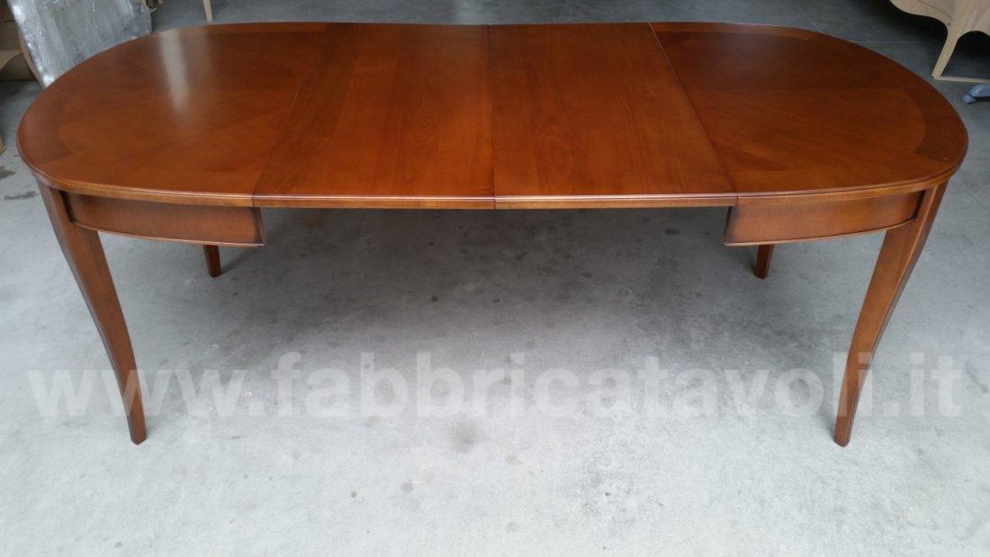 Tavolo ovale allungabile con apertura al centro, dotato di due allunghe da cm 44. Piano in legno di ciliegio e gambe in massello di faggio.