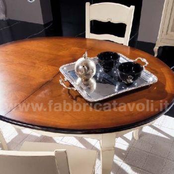 Tavolo ovale allungabile con apertura al centro, dotato di 1 allunga da cm 50. Piano in legno di ciliegio e gambe in massello di faggio.