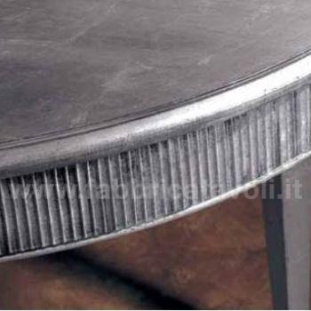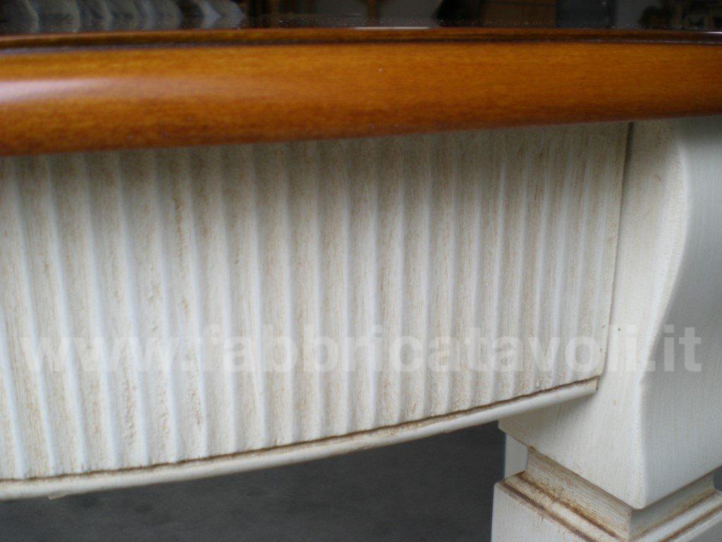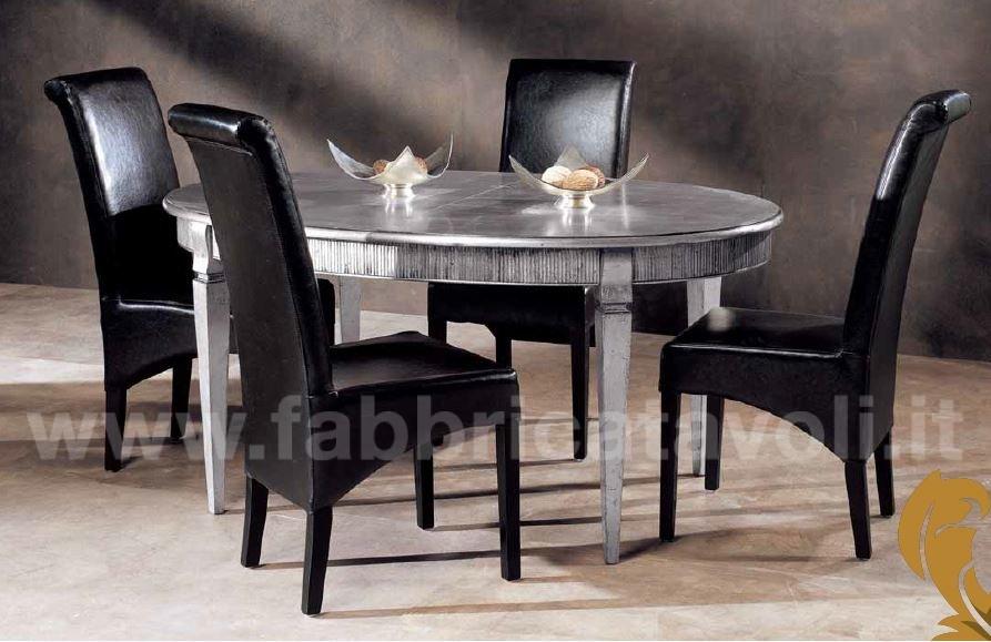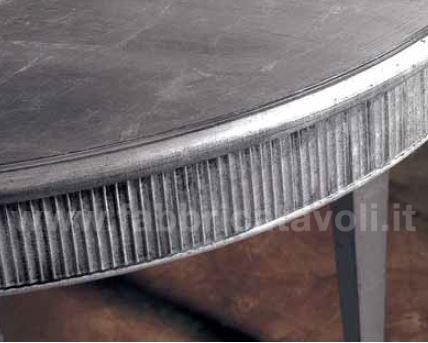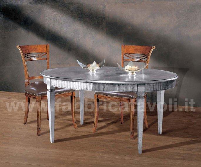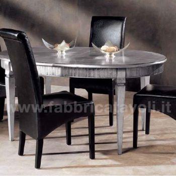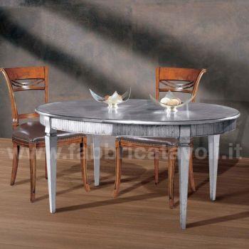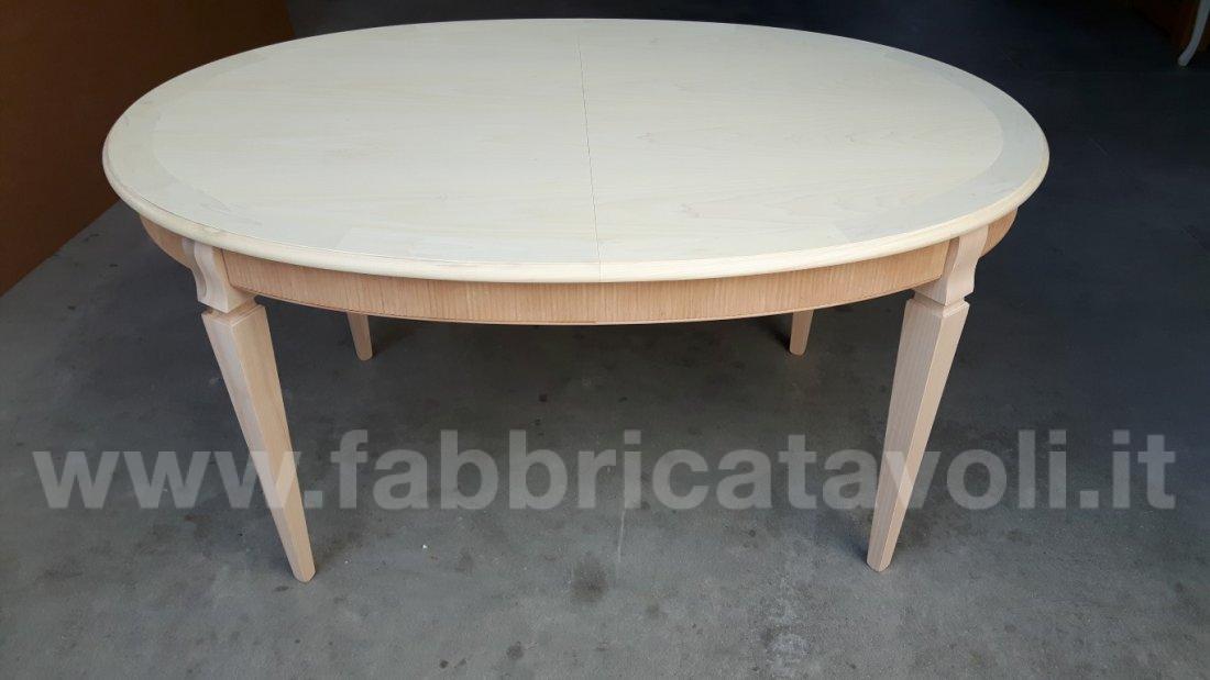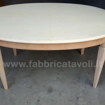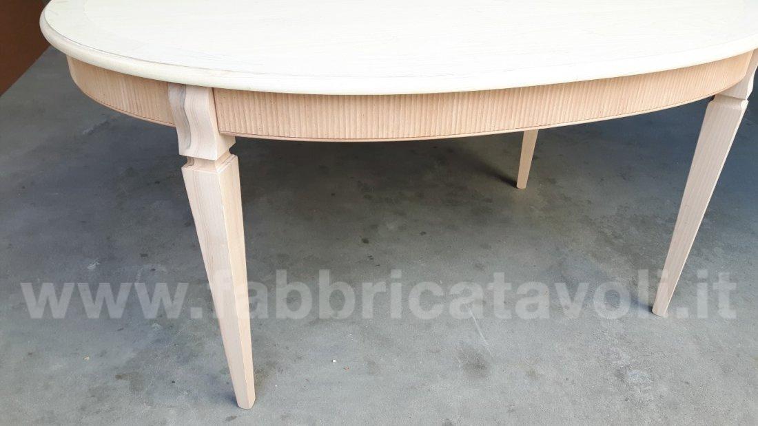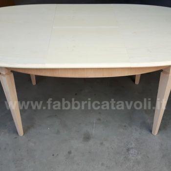 Tavolo ovale allungabile con fascia zigrinata e apertura al centro, dotato di 1 allunga da cm 50. Piano realizzato in legno e gambe in massello di faggio.