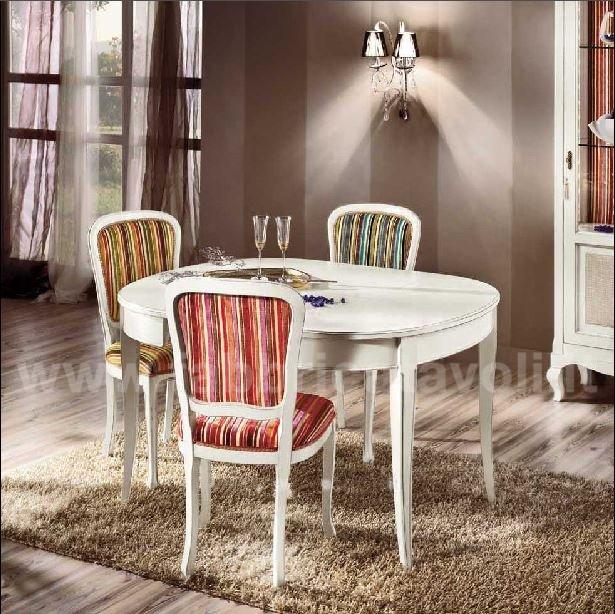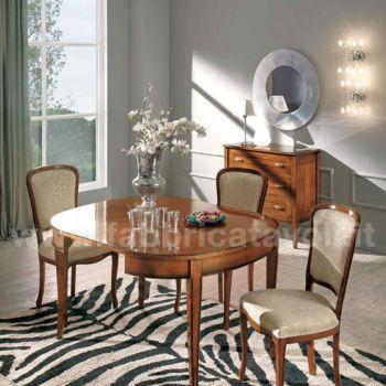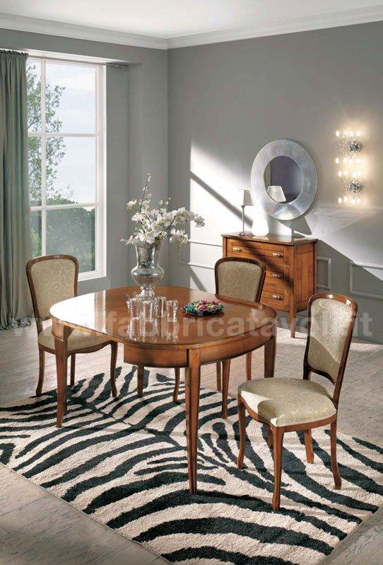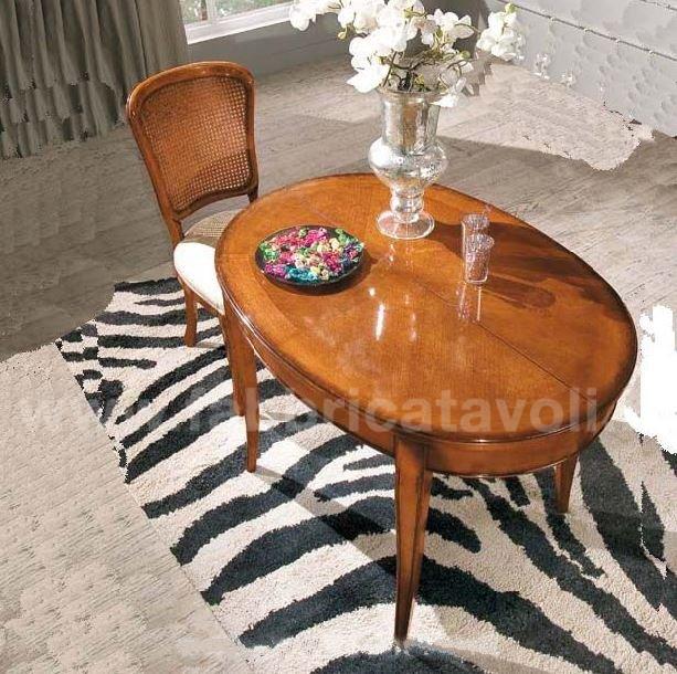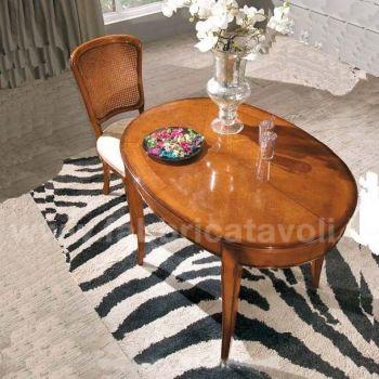 Tavolo ovale allungabile con apertura al centro, dotato di 1 allunga da 50 cm. Piano impiallacciato in legno di ciliegio, gambe in massello di faggio.