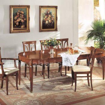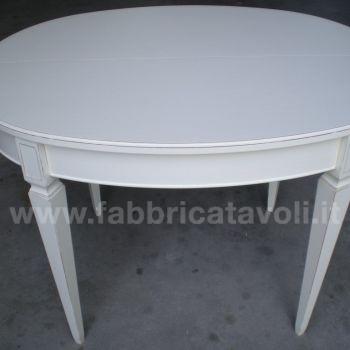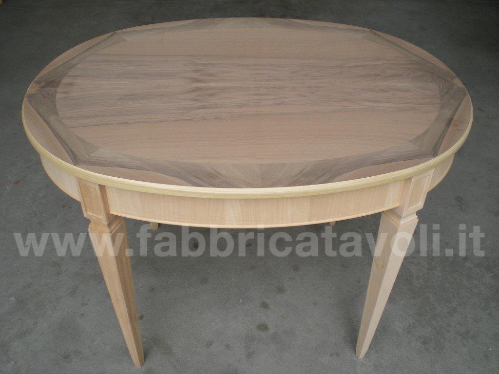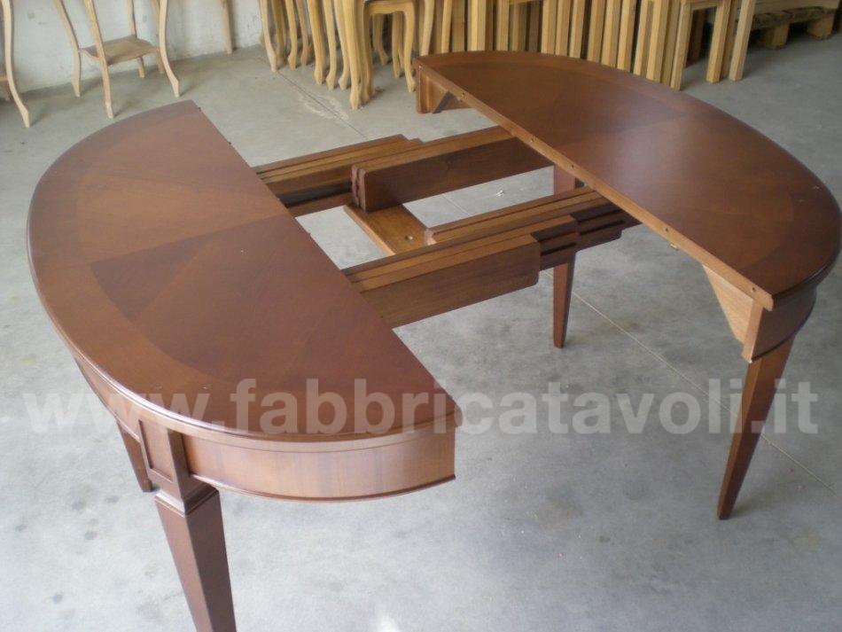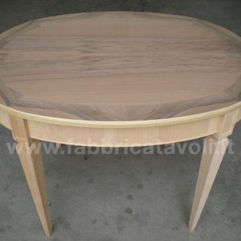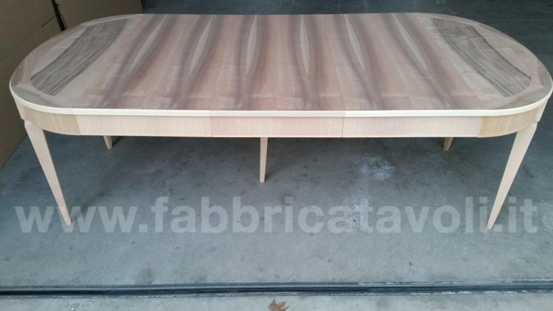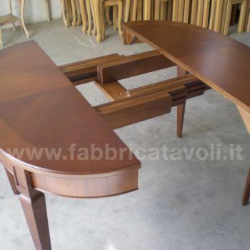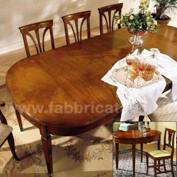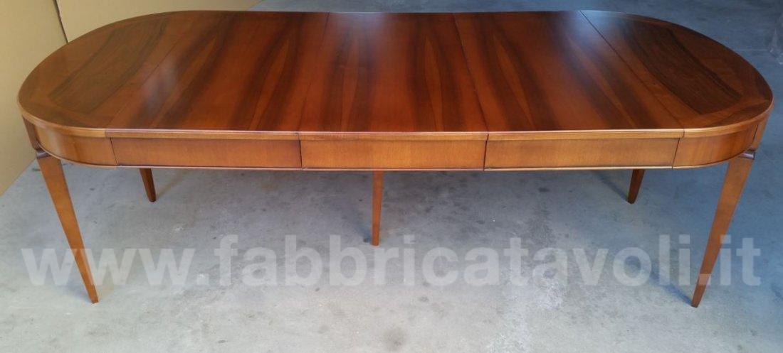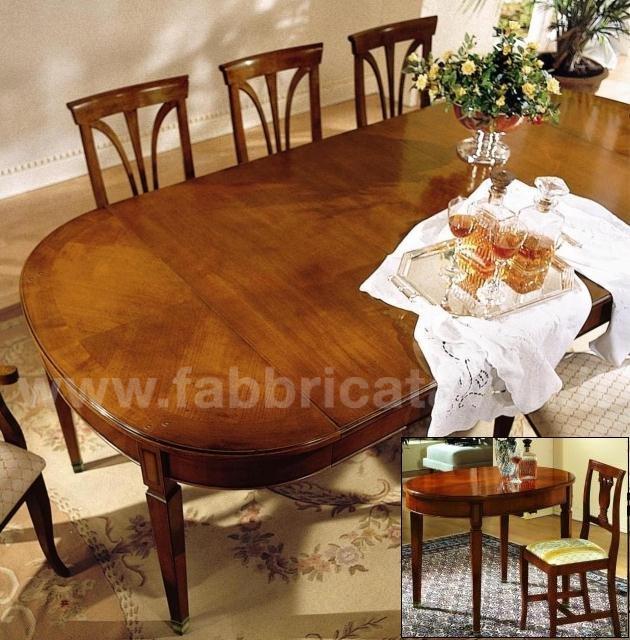 Tavolo ovalino allungabile con apertura al centro, dotato di 3 allunghe esterne da cm 50. Piano realizzato in legno di noce o ciliegio e gambe in massello di faggio.